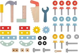 Díky gumovým pruhům na kolech je jízda tichá a šetrná k podlaze. Ergonomická rukojeť sedí do dětské ruky a zadní schránka na nářadí pojme všechny součástky. Součástí je bohatá sada dřevěných nástrojů a spojovacího materiálu pro nekonečné variace staveb.