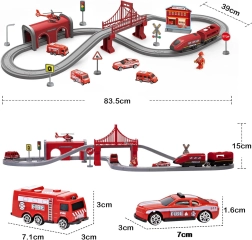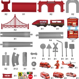 Součástí je i hasičská stanice s figurkou hasiče a záchranářská vozidla, která doplní příběhy o zásahu na trati i ve městě. Díky množství dílů lze skládat přehledné okruhy i víceúrovňové tratě s mostní konstrukcí.