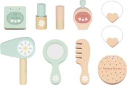 Součástí je fén, hřebínek, zrcátko, parfém, stíny, pudr, rtěnka, „řasenka“ a dvě gumičky. Vše z příjemného dřeva v pastelových barvách.