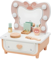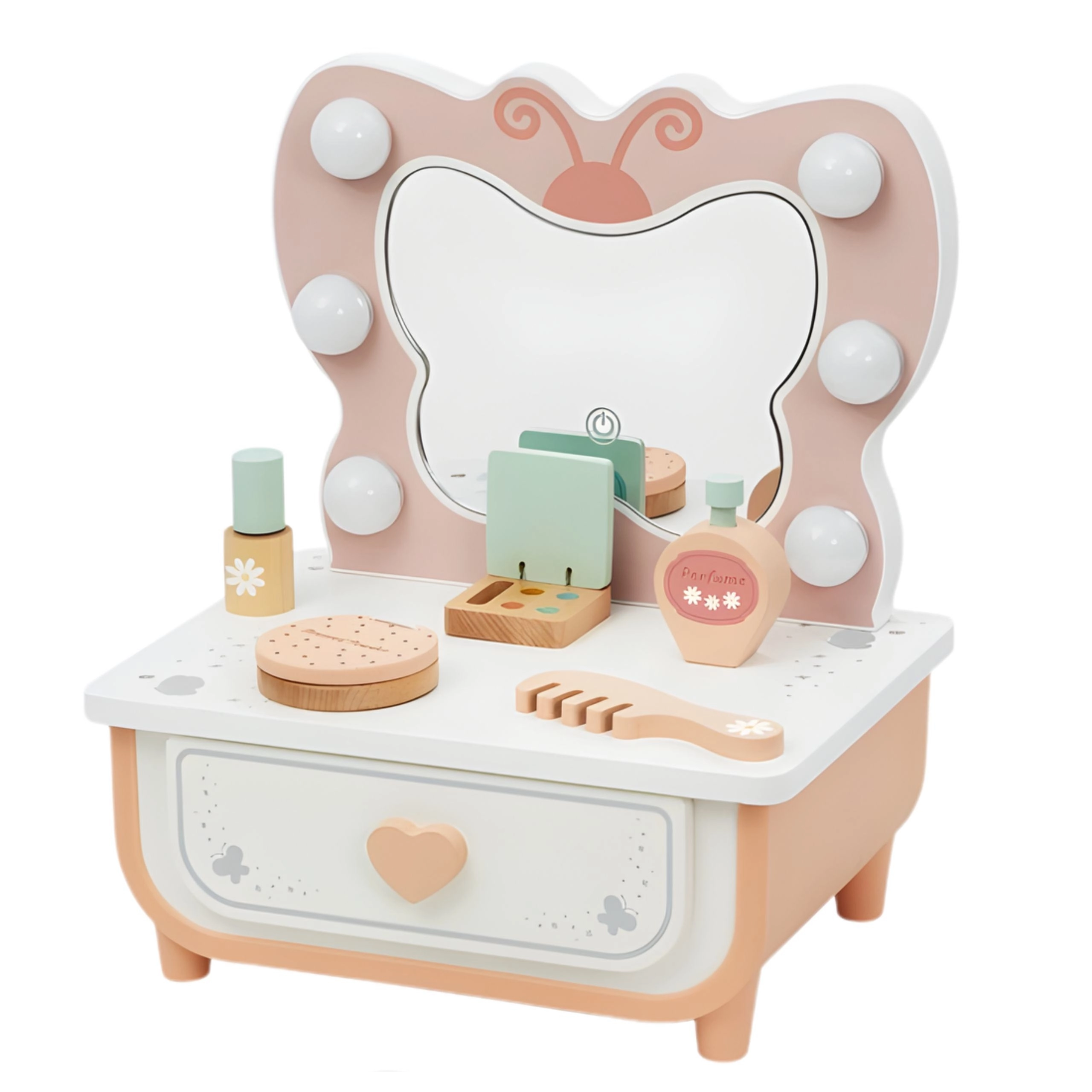 Dětská dřevěná toaletka s motýlím zrcadlem a LED "žárovičkami" přináší kouzelný prostor pro nápaditou hru. Elegantní pastelové barvy skvěle zapadnou do každého interiéru, zatímco odolné dřevěné díly jsou příjemné do ruky a bezpečné pro malé vizážistky.