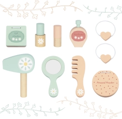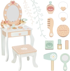 Součástí je široká paleta dřevěných doplňků – od „kosmetiky“ po hřeben či fén – které nejsou skutečnými kosmetickými přípravky, a proto jsou pro hru vhodné a bezpečné. Toaletka podporuje jemnou motoriku, samostatnost, logické myšlení a fantazii.