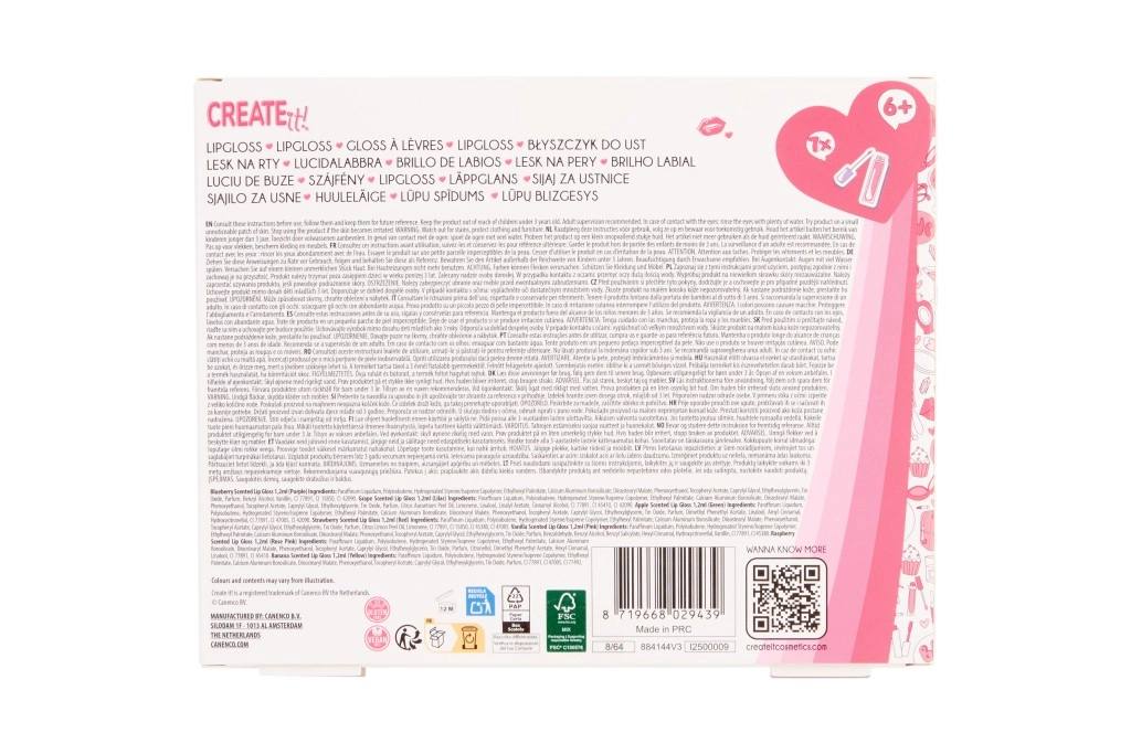 Sada CREATE IT! přináší sedm barevných lesků s třpytivým finišem, které rty krásně rozjasní a dodají jim jemný barevný nádech. Lehká textura se snadno nanáší a je vhodná pro každodenní líčení. Každý lesk voní jinak, takže si můžete užít zábavu i kreativitu při výběru.
