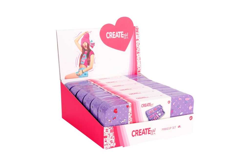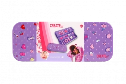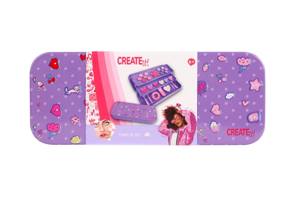 Stylová fialová make-up kazeta CREATE IT! v praktické kovové krabičce nabízí vše, co malé parádnice potřebují. Třípatrové provedení ukrývá 10 očních stínů, tvářenku, 6 lesků na rty, štětečky, gumičku do vlasů a srdíčkové zrcátko. Díky rozkládací konstrukci je obsah přehledně uspořádán a snadno dostupný – ideální na cesty i domácí líčení.