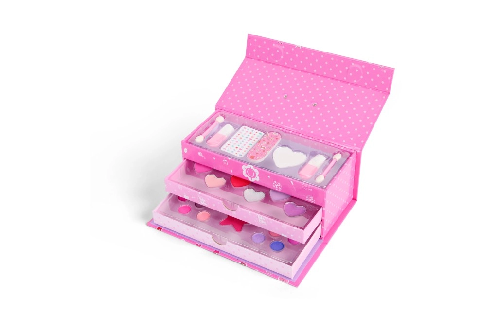 Každé patro má svoji roli: první obsahuje laky na nehty, pilník, aplikátory, samolepky a tvářenku, druhé nabízí lesky na rty a třetí patro je věnováno barevným očním stínům a dalším tvářenkám. Skvělá volba pro začátečnice, narozeninové dárky i víkendová dobrodružství.