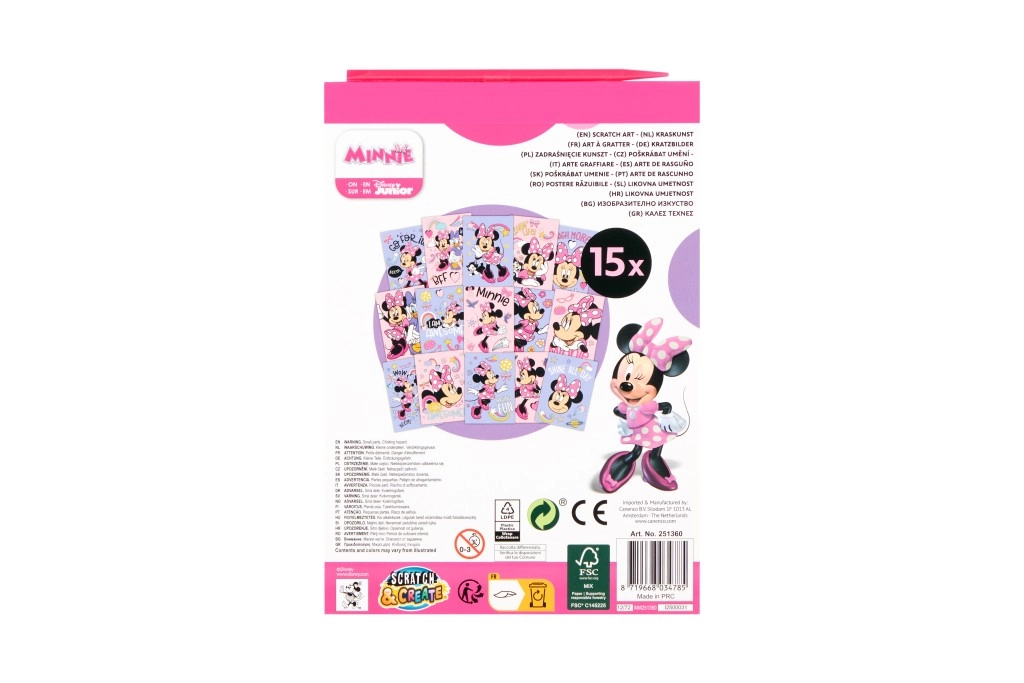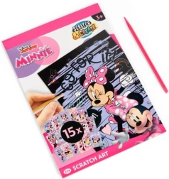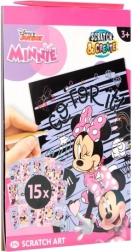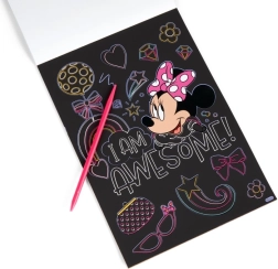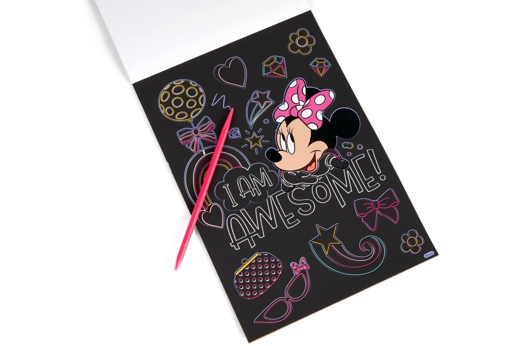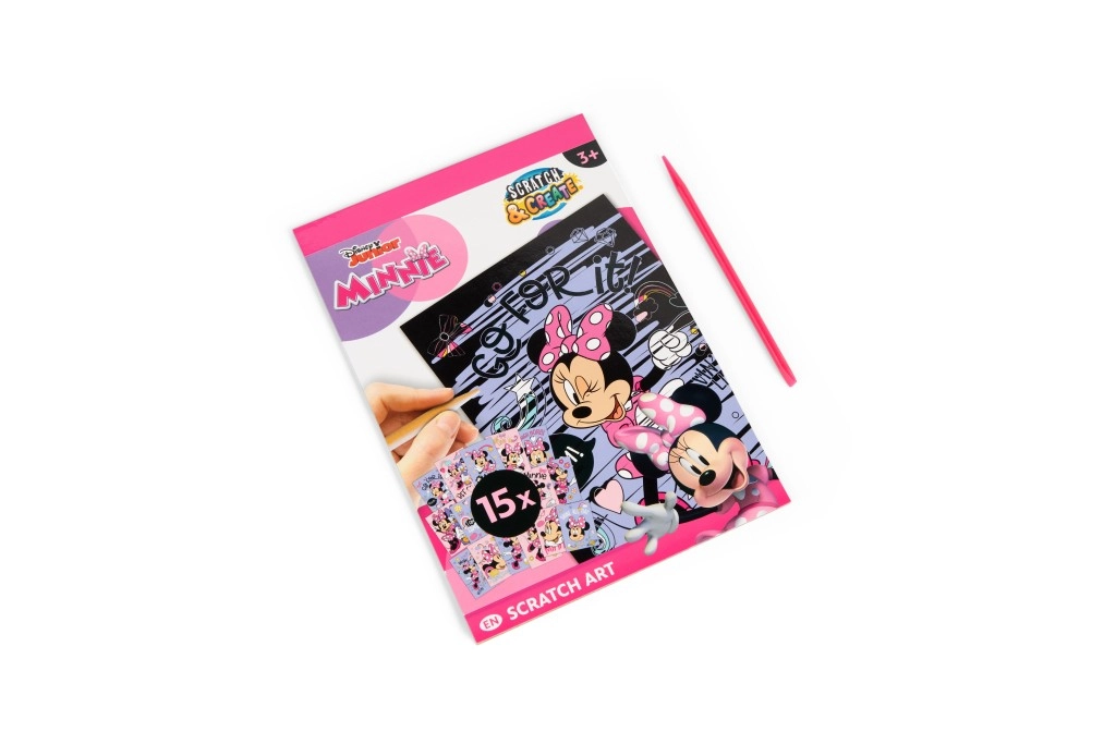 Pod černou vrstvou se ukrývají živé barvy a motivy MINNIE, které děti odhalují škrabkou – jednoduché, zábavné a návykové tvoření.