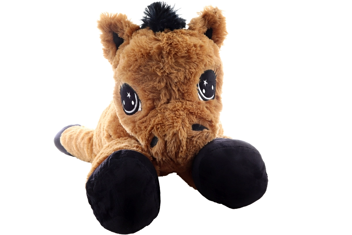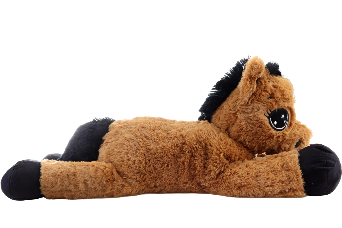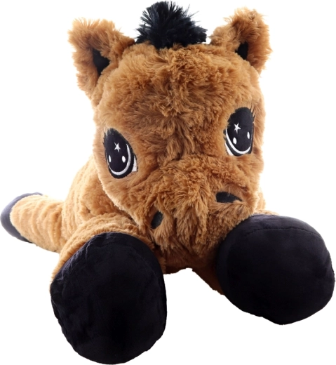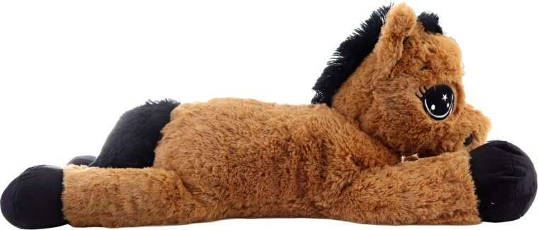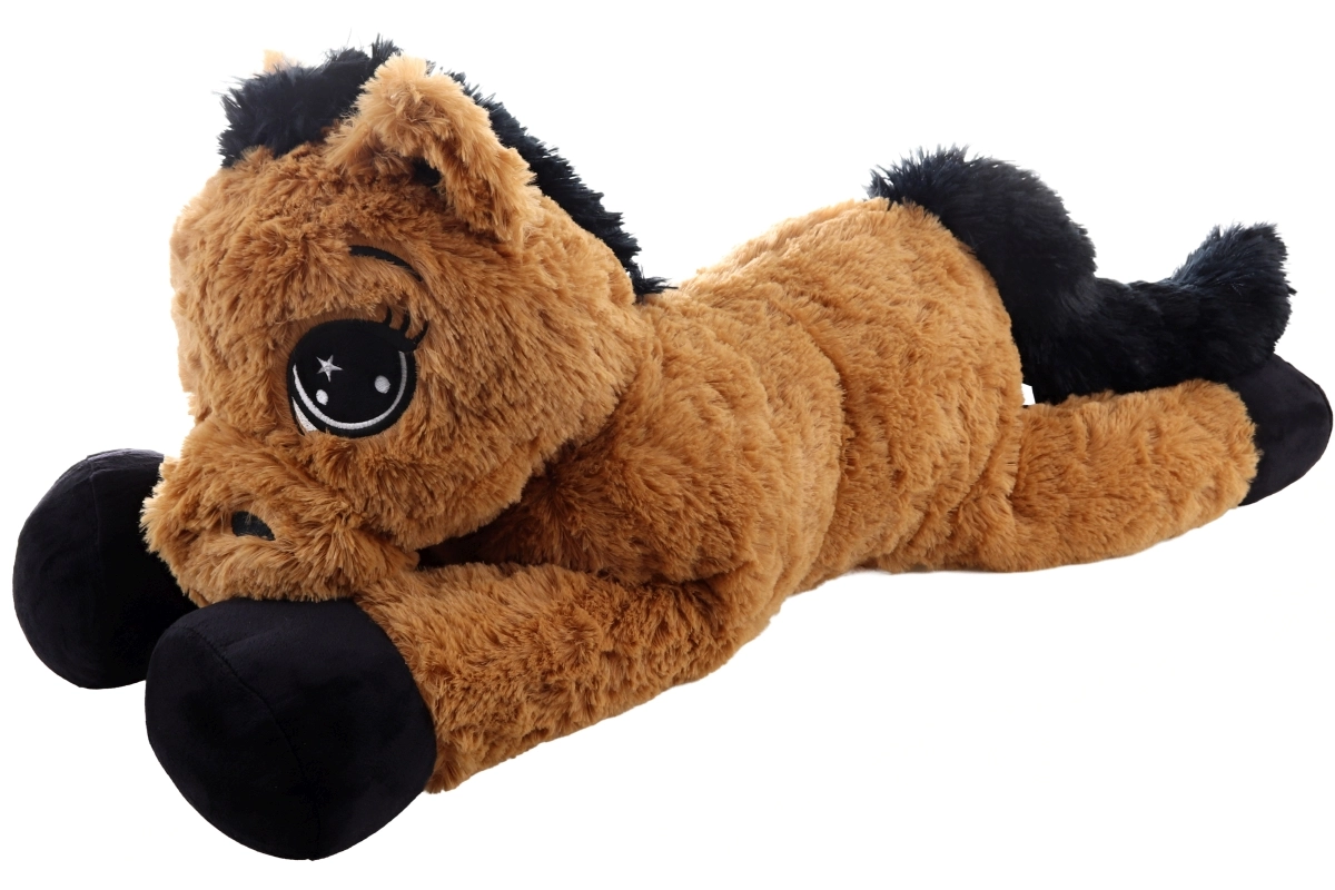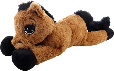 Tento hnědý ležící plyšový kůň potěší na první dotek. Má velké vyšívané oči, měkkou hřívu a ocas a působí jako mazlivý kamarád i pohodlná opora při čtení nebo sledování pohádek. Rozměry 80 × 32 × 25 cm zaručují dostatek prostoru pro objetí a odpočinek.