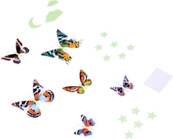 Proměňte stěny a strop v pohádkovou noční oblohu. Barevní motýli s detailními křídly dodají interiéru živost a během tmy se rozsvítí fosforeskující prvky – hvězdy, měsíček a obláčky – pro příjemné, tlumené světlo. Set je skvělý pro dětský pokoj, ložnici i hernu.
