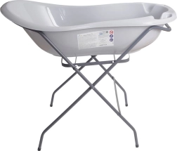 Skládací stojan na dětskou vaničku umožňuje koupat miminko v pohodlné výšce bez zbytečného ohýbání zad. Robustní kovová konstrukce a protiskluzové koncovky zajišťují bezpečné a stabilní používání.