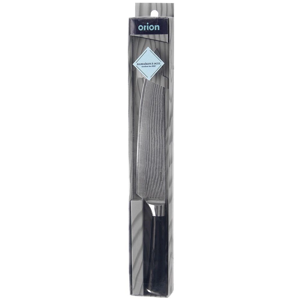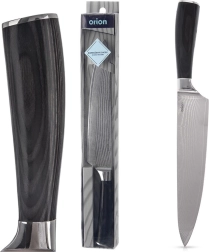 Univerzální kuchařský nůž z damaškové oceli s délkou 33,5 cm a 20cm čepelí nabízí precizní krájení a sekání ovoce, zeleniny i masa. Ergonomická rukojeť z pakka dřeva skvěle padne do ruky, je odolná vůči vlhkosti a chemii. 67 vrstev oceli zajišťuje výjimečnou ostrost, trvanlivost a charakteristický vzor na čepeli. Vhodný pro domácí i profesionální použití.