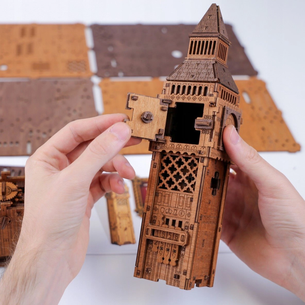 Zapojte logiku, jemnost a trpělivost – síla zde není potřeba. Každý dílek přesně zapadá a odhaluje skrytá řešení mechanického puzzle. Model v sobě spojuje kouzlo londýnské věže s hodinami s výjimečným únikovým mechanismem pro jedinečný zážitek ze skládání i objevování.
