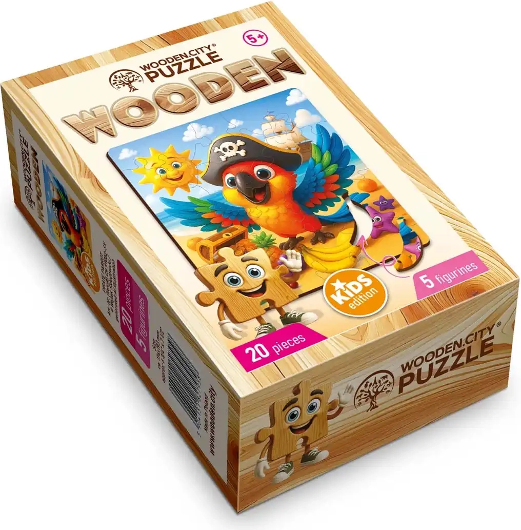 Objevte kouzlo kvalitních dřevěných puzzlí WOODEN CITY s motivem pirátského papouška. Sada o 20 dílcích nabízí 5 unikátně tvarovaných dílků, hladké hrany bez třísek díky preciznímu laserovému zpracování a podporuje soustředění, trpělivost a kreativitu dětí. Součástí je samostatná předloha pro snadnější skládání.