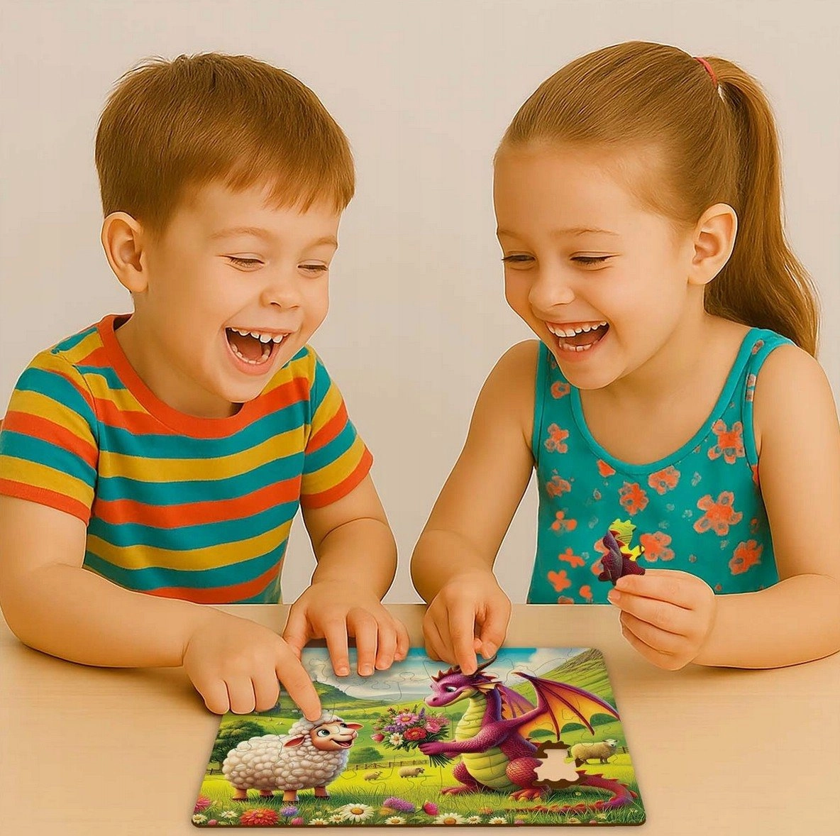 Pět speciálně tvarovaných dílků přidává do skládání překvapení a motivuje děti k opakované hře.