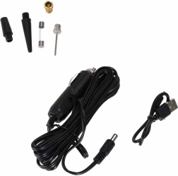 - elektrická pumpa/mini kompresor, hadice, 5× výměnná koncovka, kabel USB, kabel do autozapalovače, návod