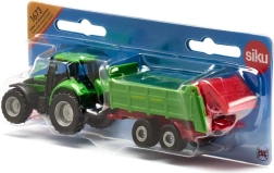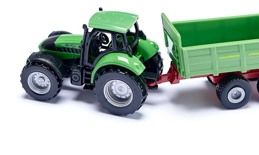 Traktor DEUTZ s rozmetadlem STRAUTMANN v kompaktním měřítku nabízí detailní zpracování, funkční tažné spojení a plynulá kola pro snadné ježdění.