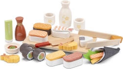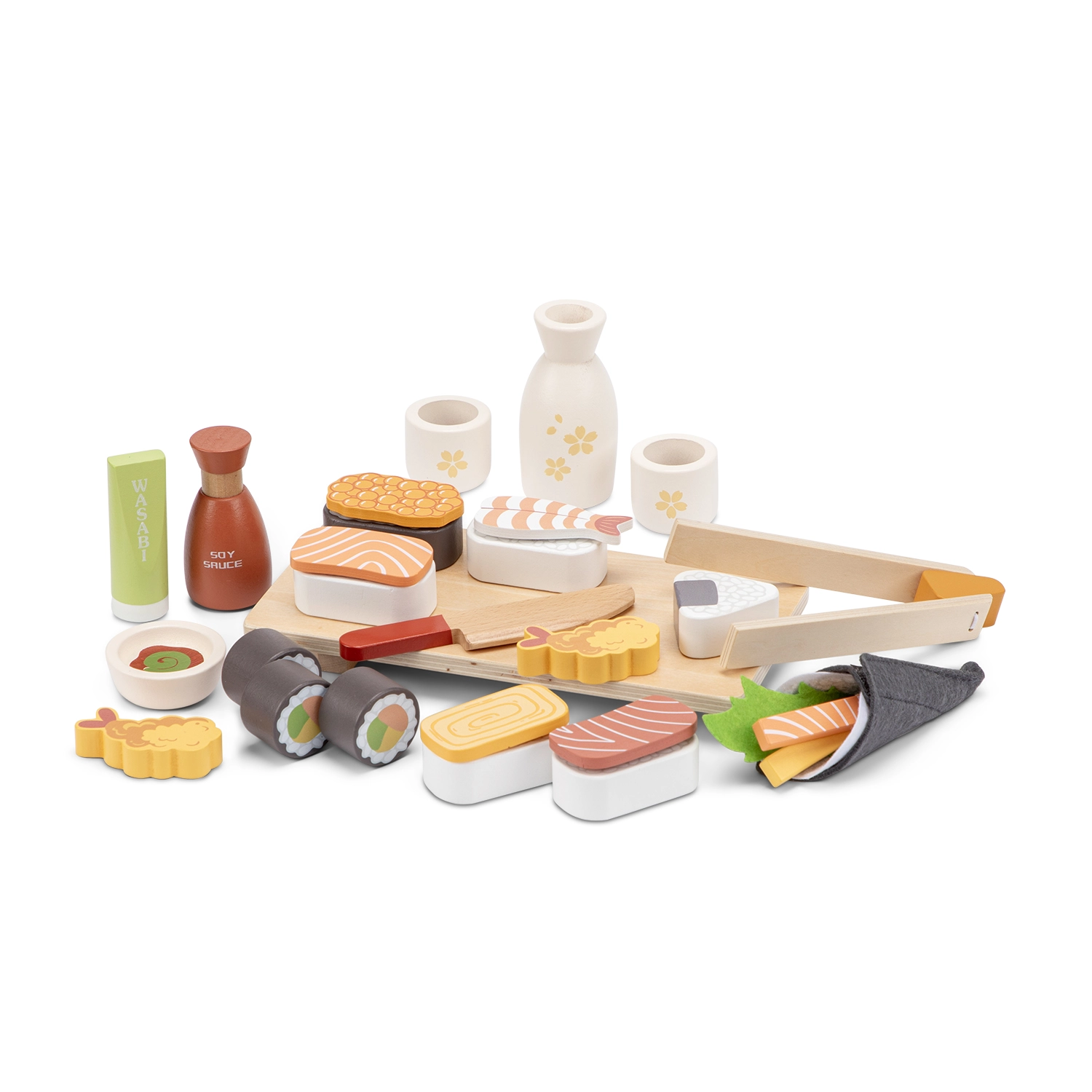 Tato bohatě vybavená sada umožňuje dětem připravit vlastní "hostinu" – od nigiri a rolky až po wasabi a sójovou omáčku. Součástí je servírovací podnos, hůlky s dětským úchopem, nůž, miska, tongs/tyčinky a i lahev se saké se šálky. Každý kousek je detailně malovaný pro realistický dojem.