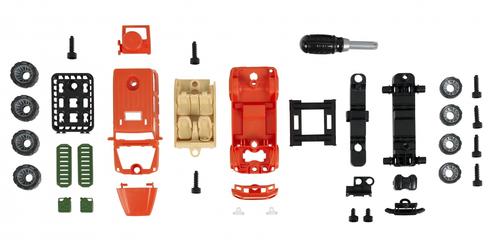 Díky systému šroubků a přiloženému nástroji si děti auto samy sestaví, vyzkouší si práci malého mechanika a pochopí základní principy konstrukce.