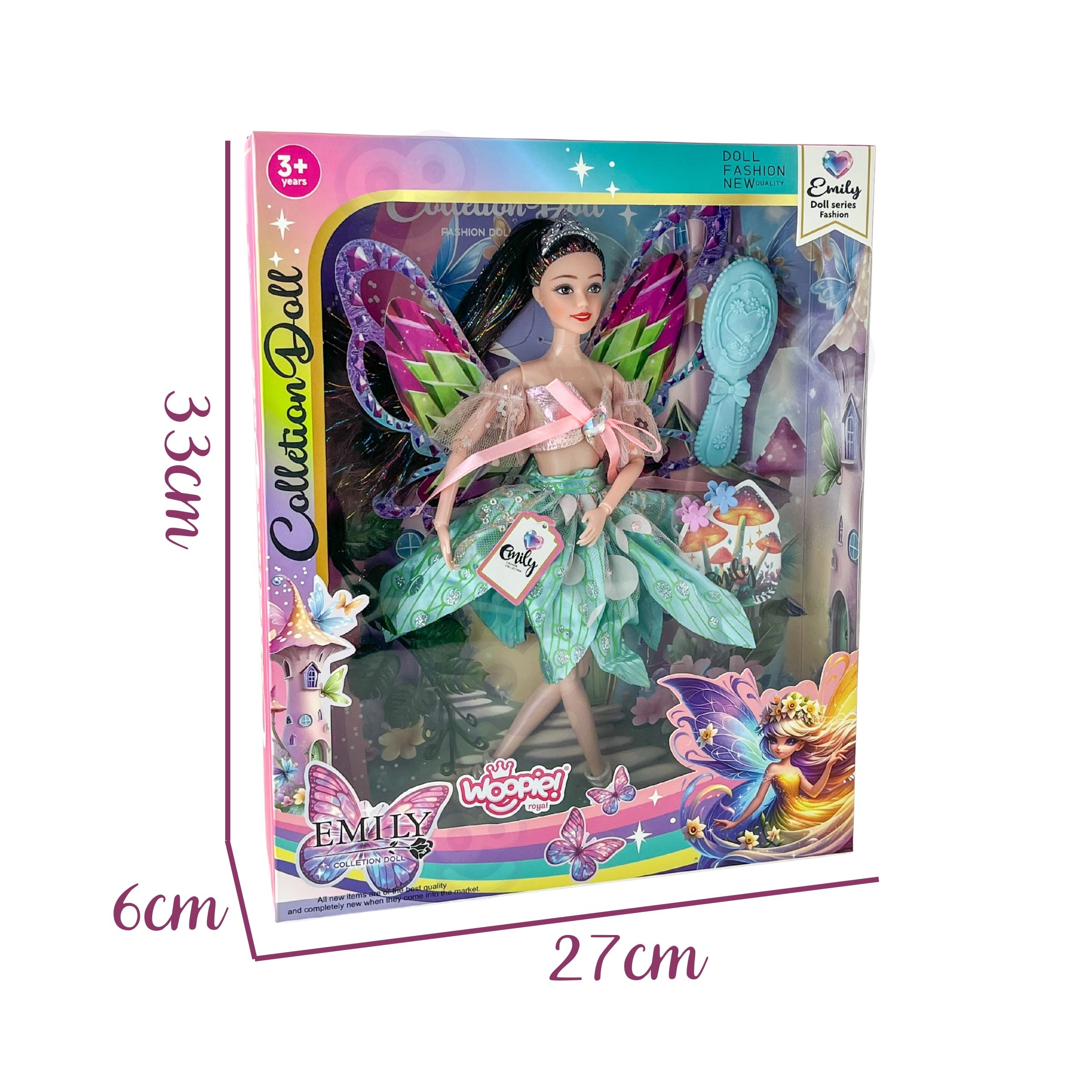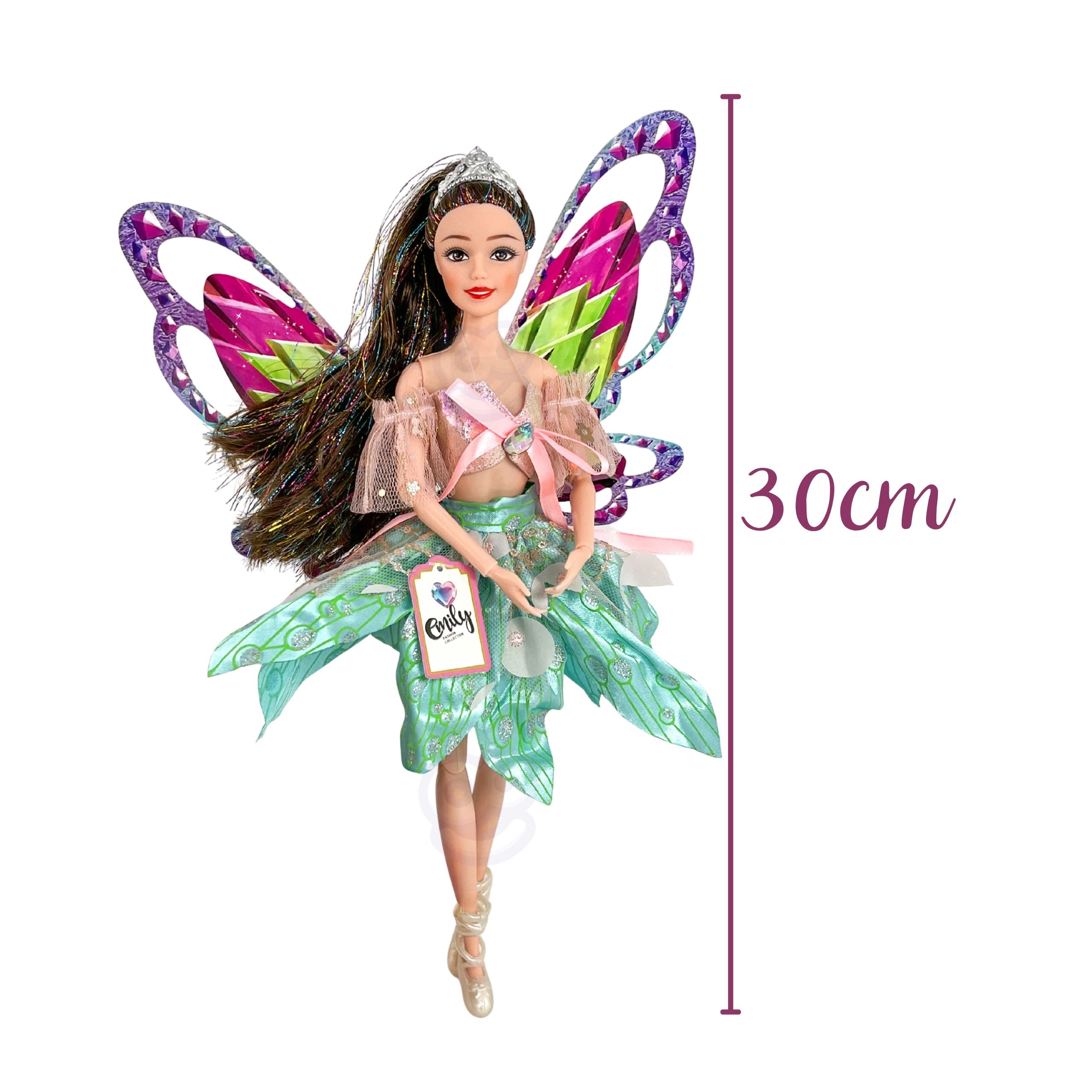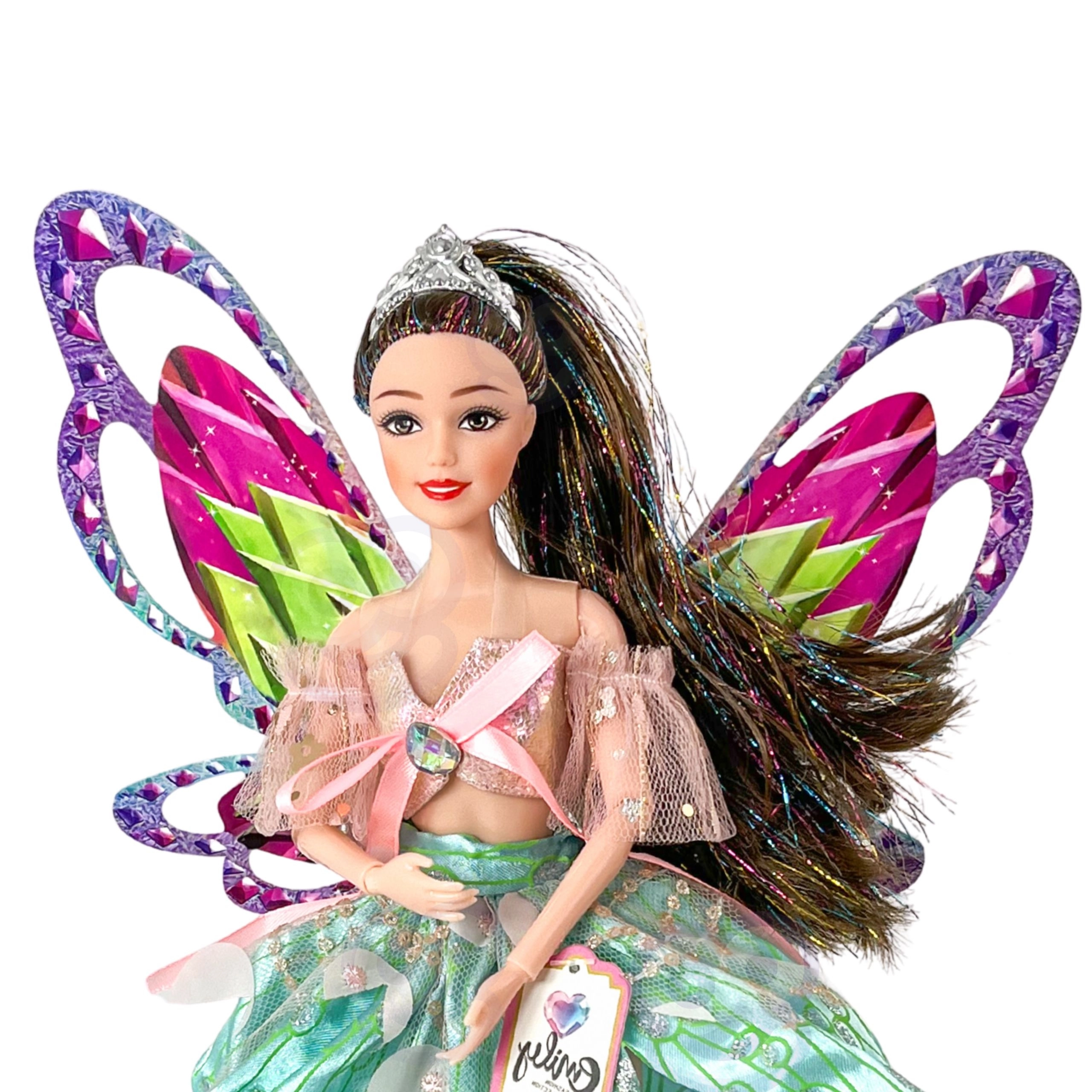 Panenka Emily je jako stvořená pro malé snílky, kteří milují pohádky, módu a kouzelná dobrodružství. Její velká barevná křídla a třpytivé detaily vytvářejí efekt opravdové víly, zatímco elegantní šaty s tylovými rukávky působí slavnostně a fotogenicky.