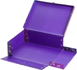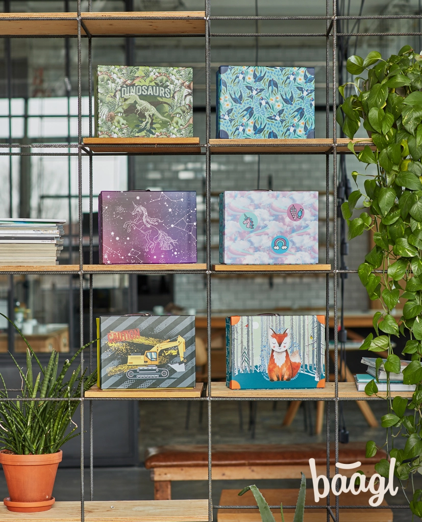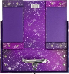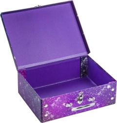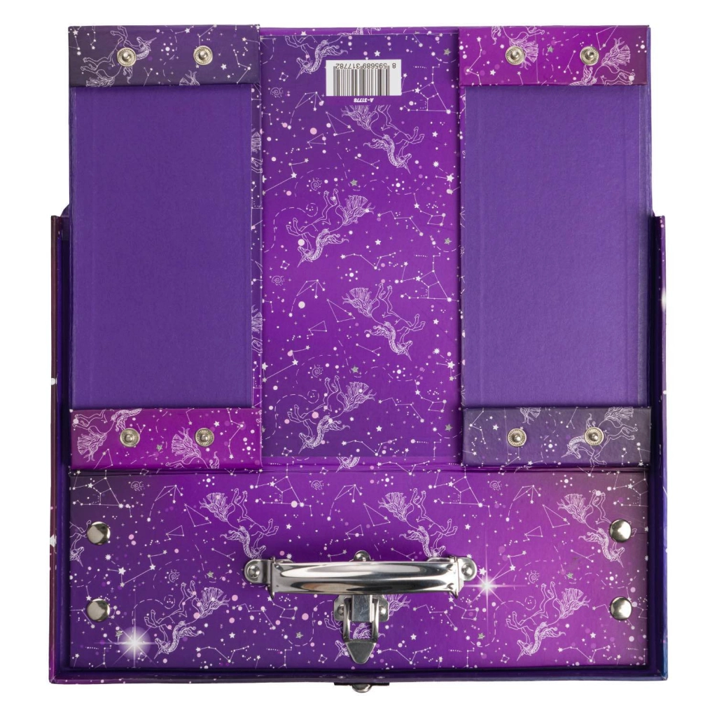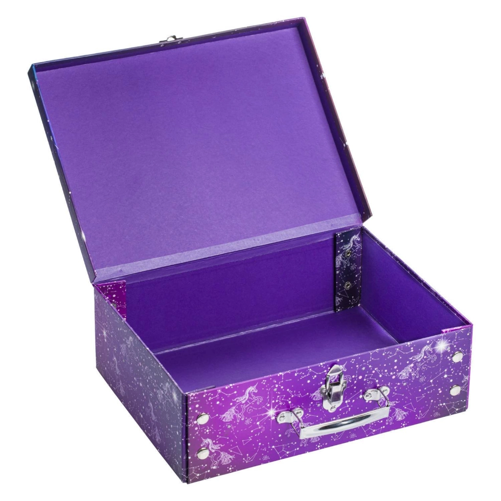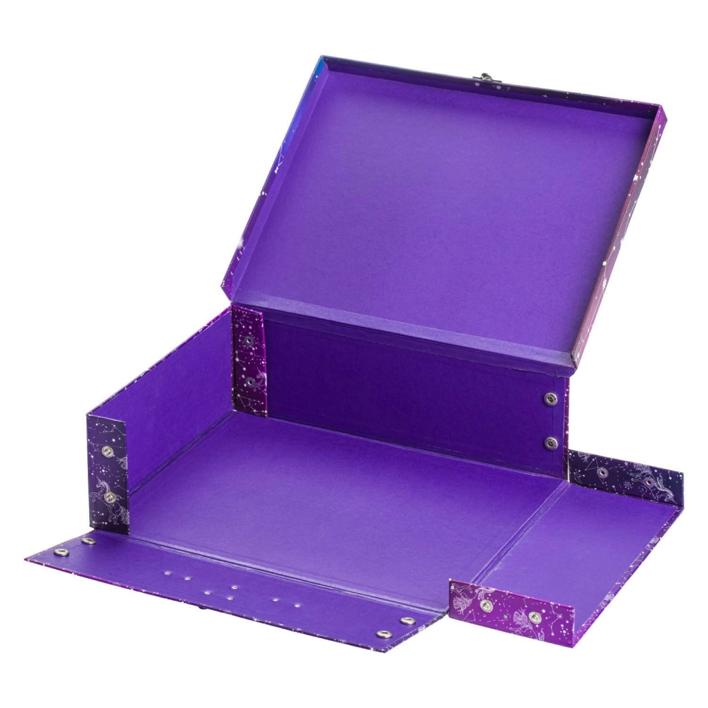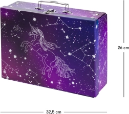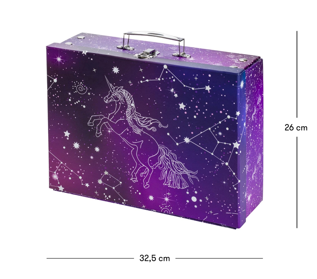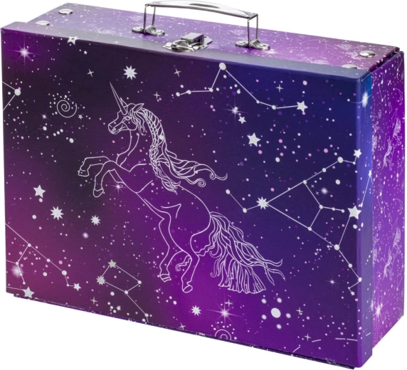 Praktický a stylový školní kufřík Baagl s motivem Unicorn Universe z pevného laminovaného papíru. Díky skládacímu provedení s patentky ho snadno rozložíte i znovu složíte, má kovové ucho a bezpečné zapínání na přezku – ideální pro přenášení výtvarných potřeb, sešitů či drobností.