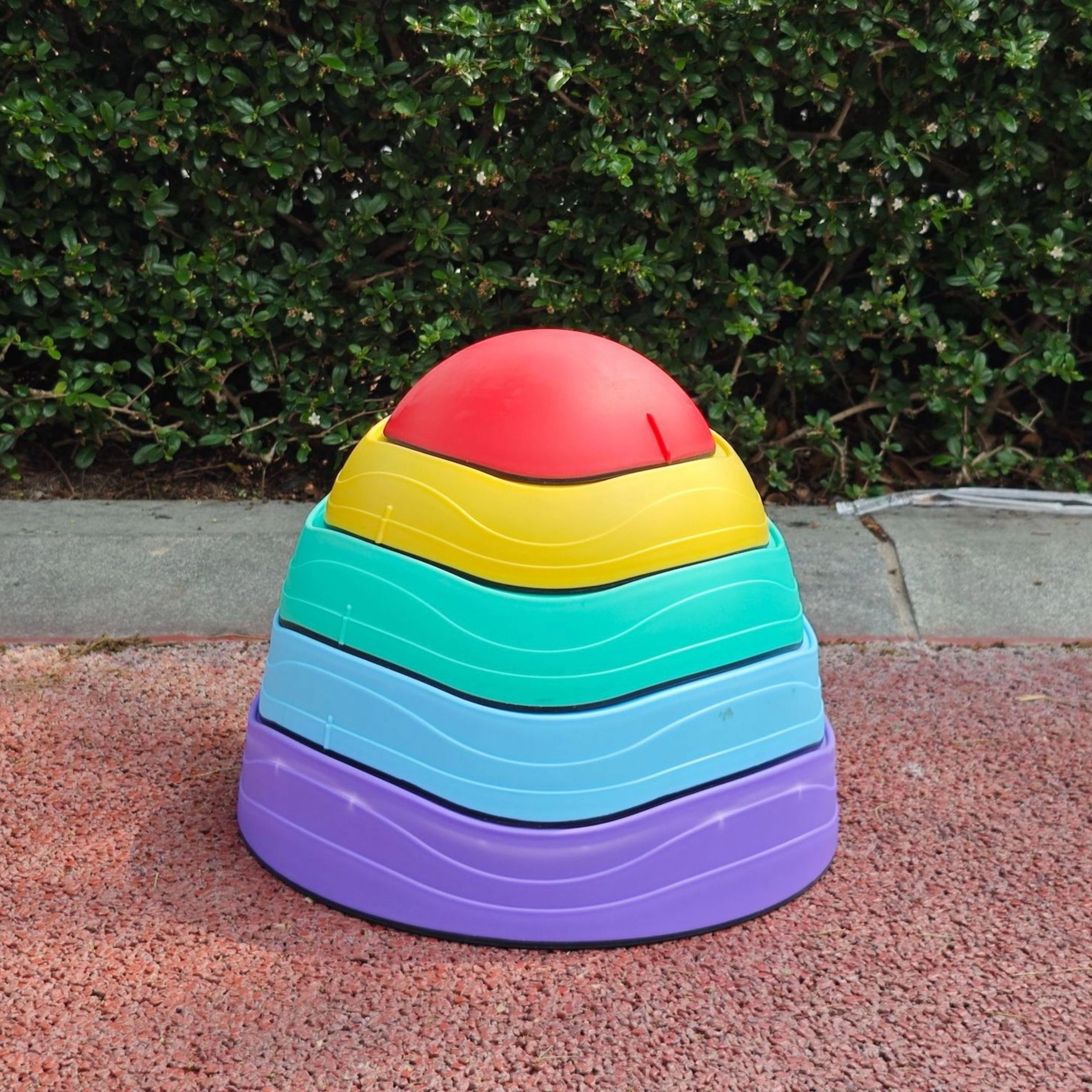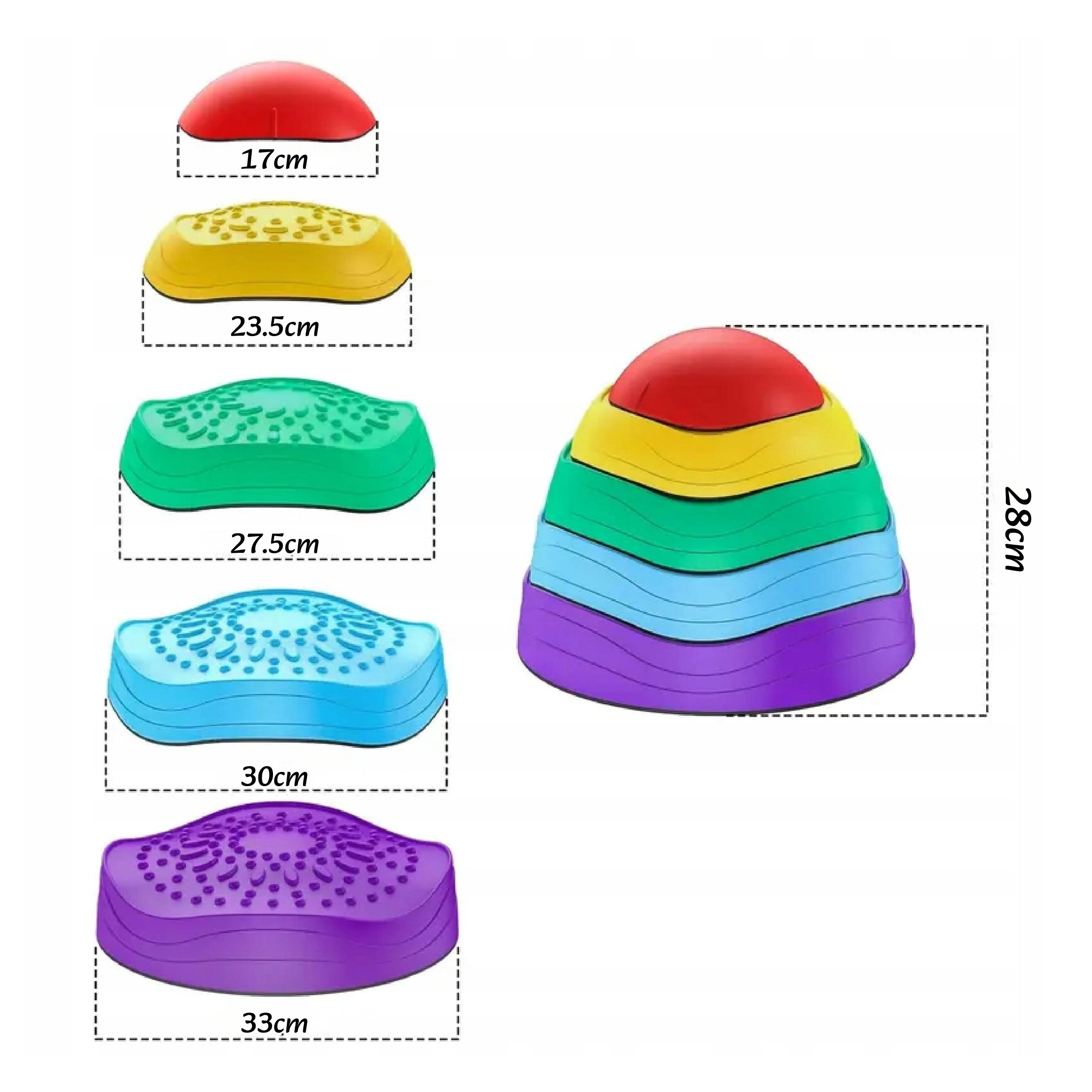 Díky protiskluzové základně zůstávají kameny při hře stabilní a texturovaný povrch stimuluje smyslové vnímání chodidel i dlaní. Stohovatelný design šetří místo při ukládání a pestré barvy přirozeně lákají k pohybu.