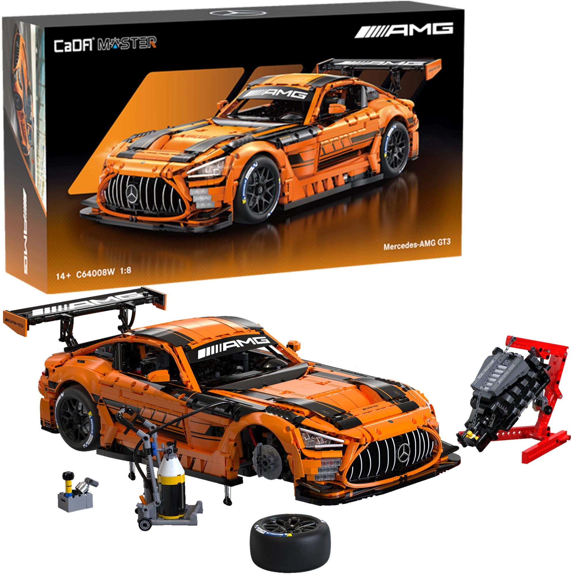 Postavte si ikonický závodní vůz MERCEDES-AMG GT3 v měřítku 1:8 z prémiové série CaDA Master. Tento detailní model s 5466 dílky nabízí 8stupňovou převodovku, nezávislé a nastavitelné odpružení, řízení předních kol, otevíratelné a uzamykatelné dveře, modulární motor i kapotu a navíc LED osvětlení. Skutečnou perličkou je pneumatický zvedák pro simulaci pit-stopu a výměny kol – maximální technické zážitky při stavbě i vystavení.
