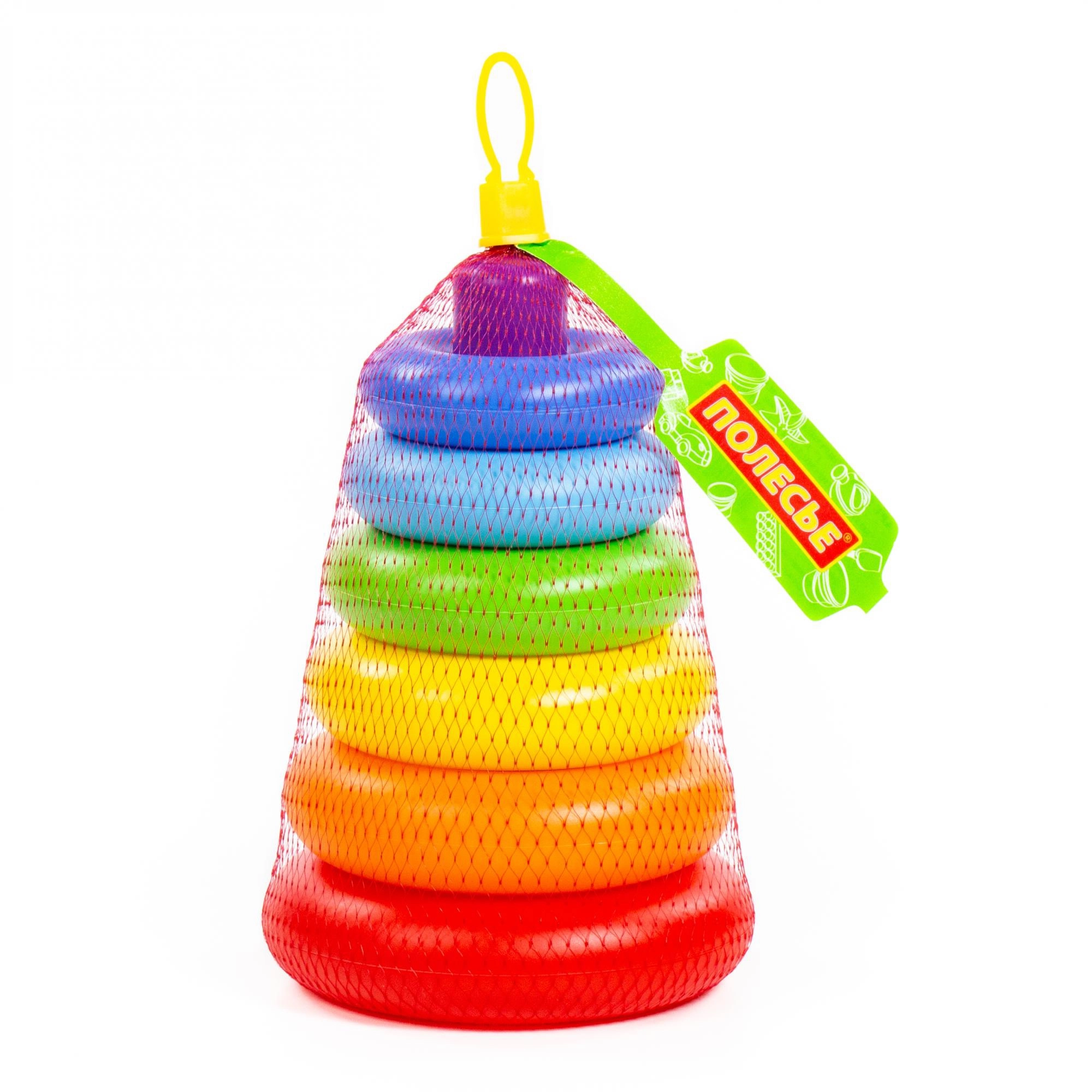Šest kroužků v zářivých barvách a robustní středový kužel podporují vizuální vnímání a samostatné skládání.