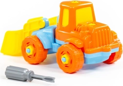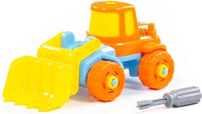Součástí je jednoduchý dětský šroubovák – děti mohou bagr rozebírat a znovu skládat, čímž trénují jemnou motoriku a trpělivost.