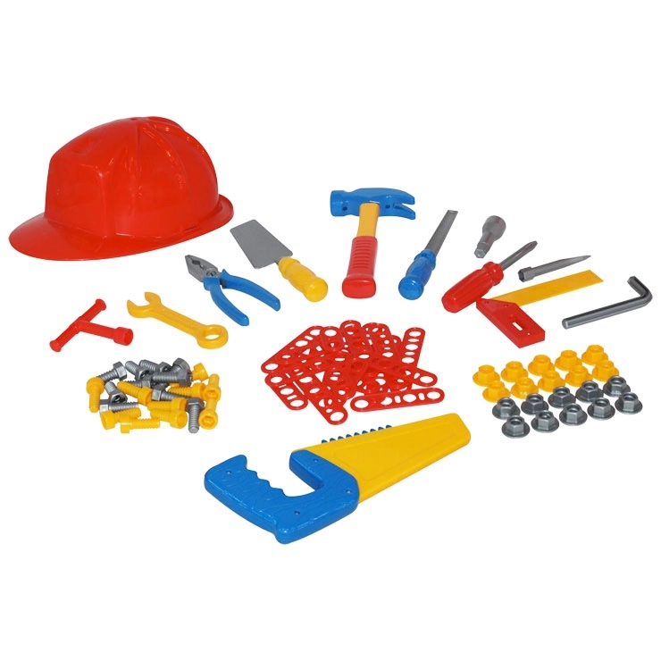 - Šroubovák s vyměnitelnými hroty (1 ks), kombinovaný klíč – otevřený a očkový (1 ks), šestihranný šroubovák (1 ks), imbusový klíč (1 ks), kleště (1 ks), úhelník s pravítkem (1 ks), hladítko (1 ks), rašple (1 ks), kladivo (1 ks), ruční pilka (1 ks), přilba (1 ks), spojovací destičky (20 ks), šestihranné šrouby (10 ks), šrouby pro klíč a šroubovák (10 ks), matice (20 ks)