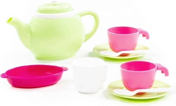 Sada obsahuje čajovou konvičku s víčkem, hrnečky, podšálky, lžičky a servírovací tác/mištičku. Díky kontrastním barvám je pro děti vizuálně přitažlivá a podporuje jejich smyslový rozvoj.