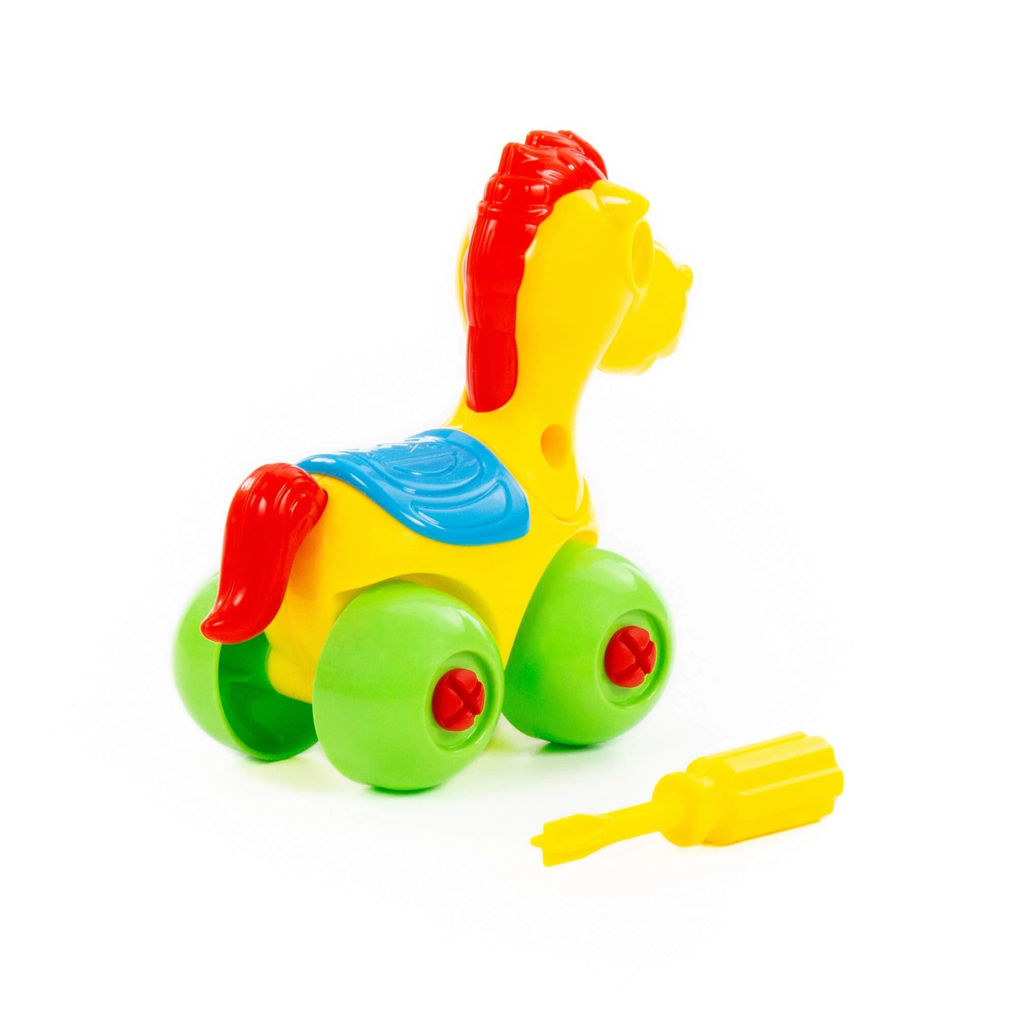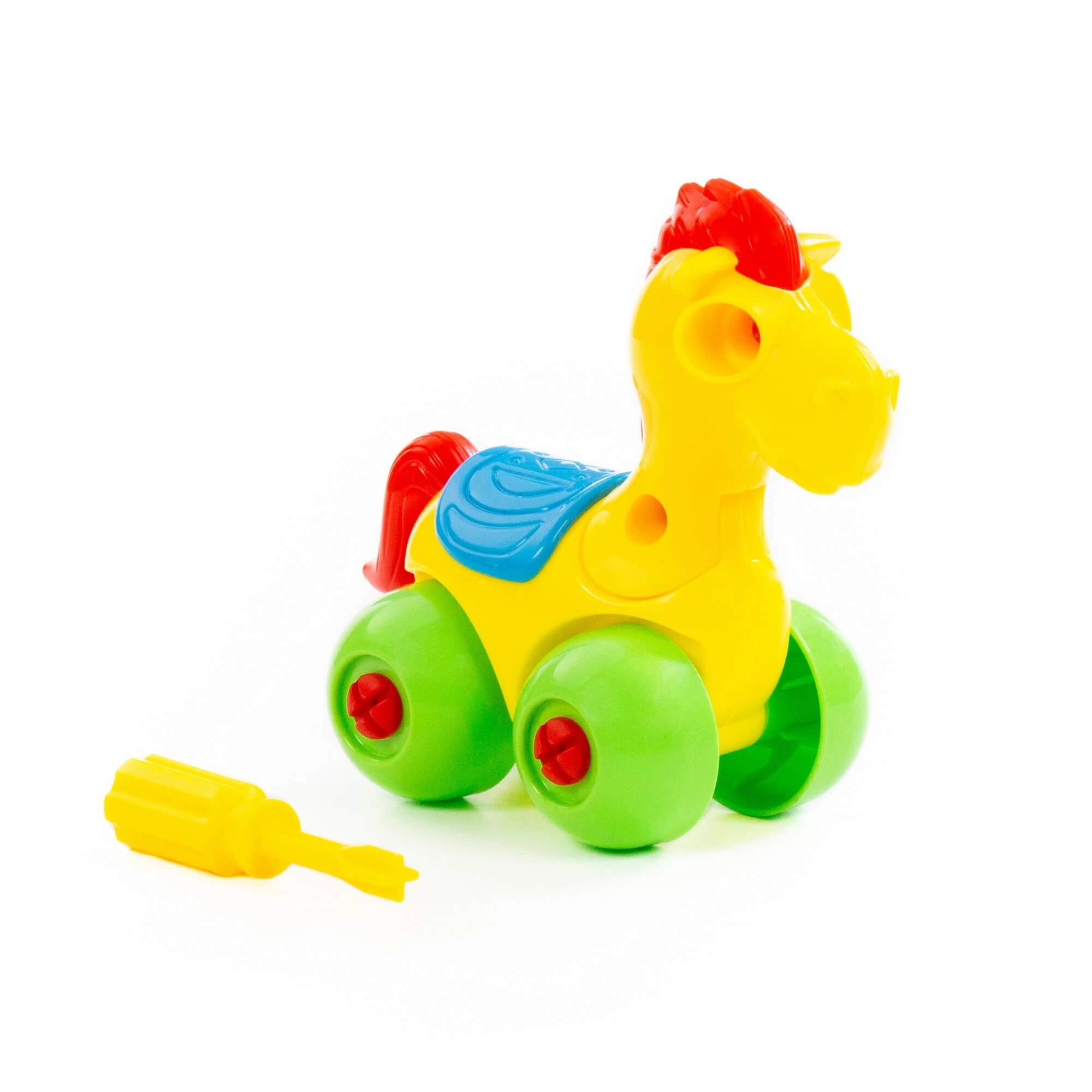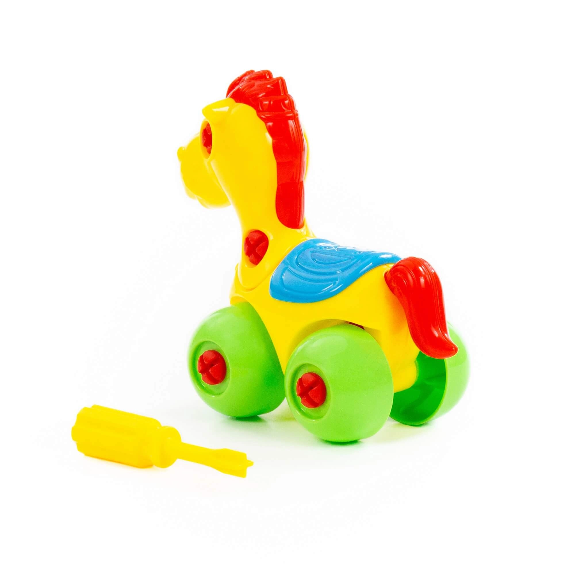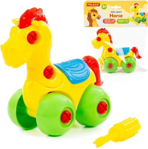 Tento barevný šroubovací koník na kolečkách je skvělou volbou pro děti, které rády objevují, jak věci fungují. Díky přiloženému šroubováku lze jednotlivé díly snadno rozebrat a opět složit, což rozvíjí trpělivost a zručnost.