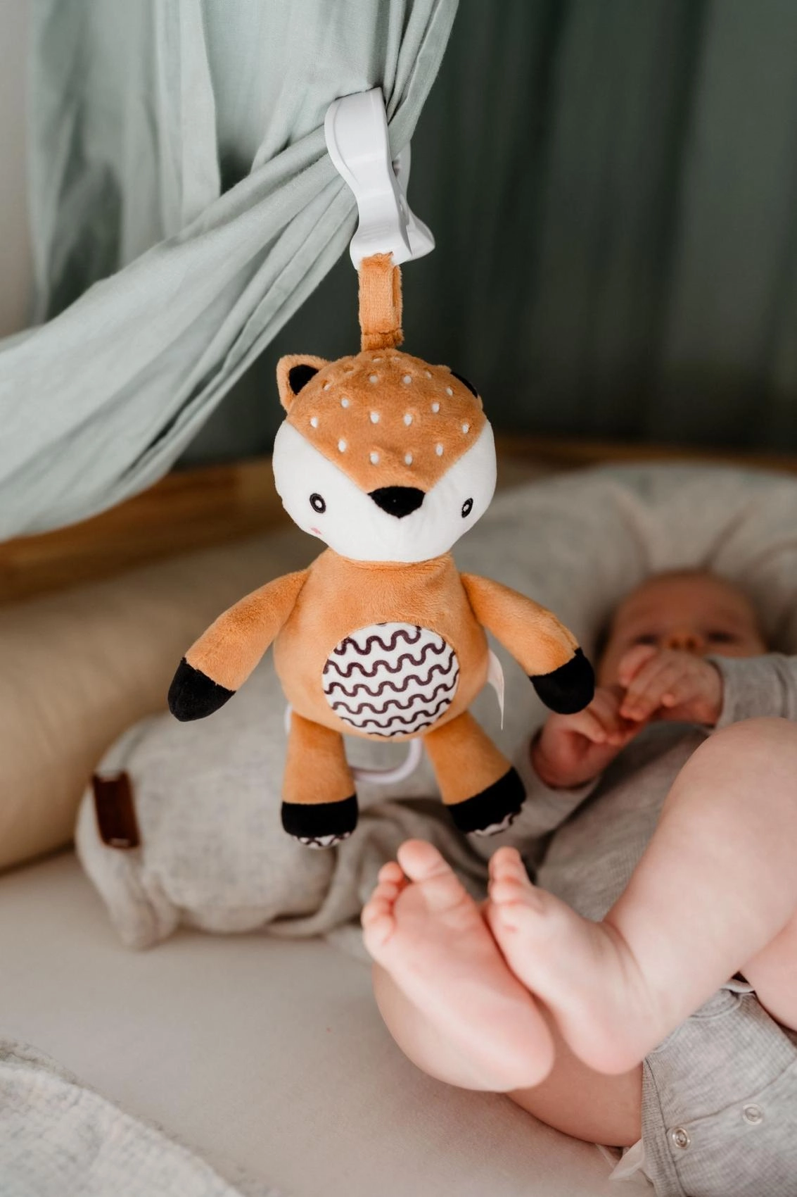 Závěsný plyšový srneček je ideální společník doma i na cestách. Měkký materiál láká k dotekům a mazlení, zatímco chrastítko uvnitř tělíčka miminko jemně zaujme a pomáhá rozvíjet jeho smysly. Díky univerzálnímu klipu hračku snadno upevníte na kočárek, postýlku, autosedačku nebo hrací hrazdičku.