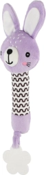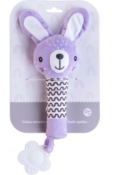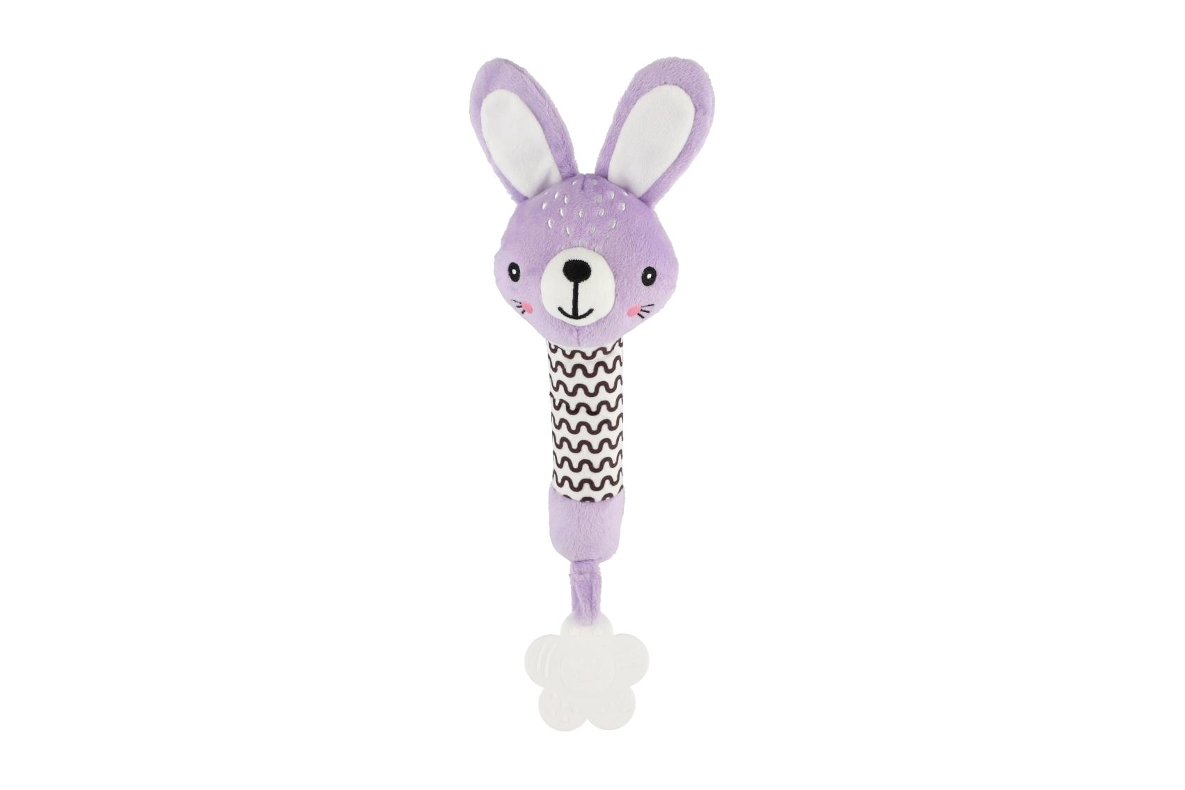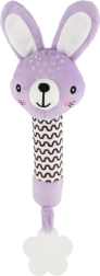 Fialový plyšový zajíček je ideální první hračka pro novorozence. Lehká konstrukce a dlouhé měkké tělíčko se skvěle drží v malých ručičkách, po stisku vydává jemný pískací zvuk, který přirozeně upoutá pozornost miminka a podporuje vnímání zvuků.