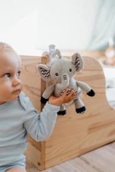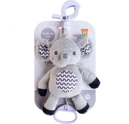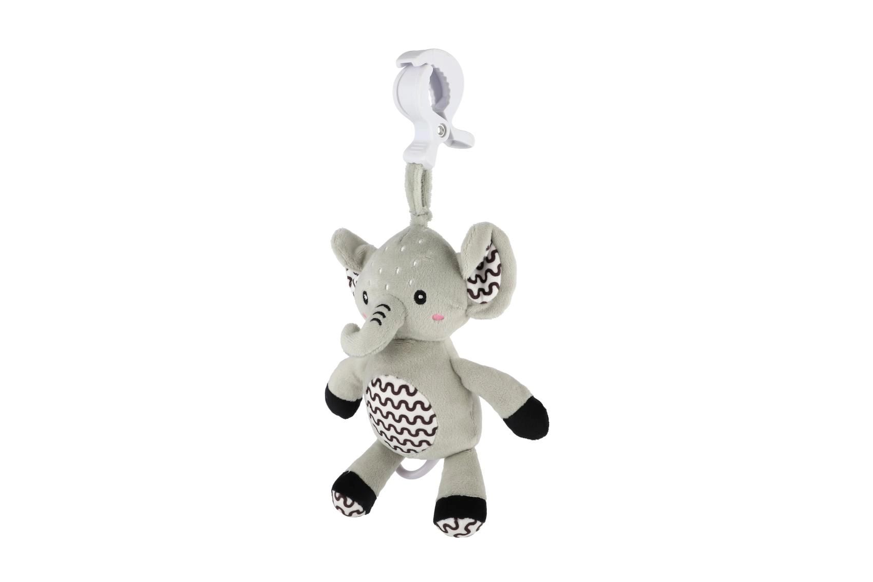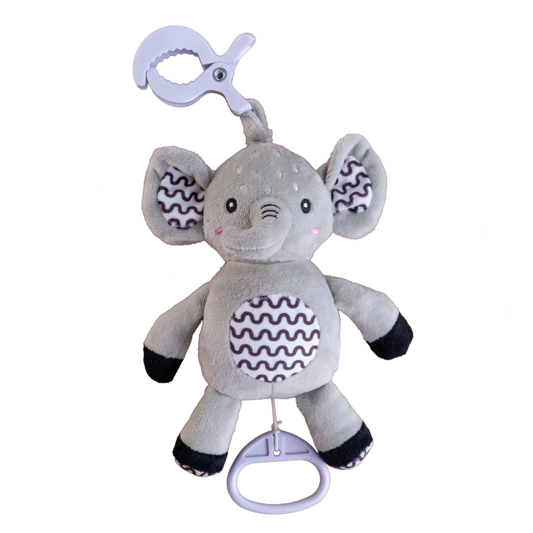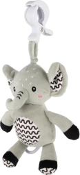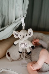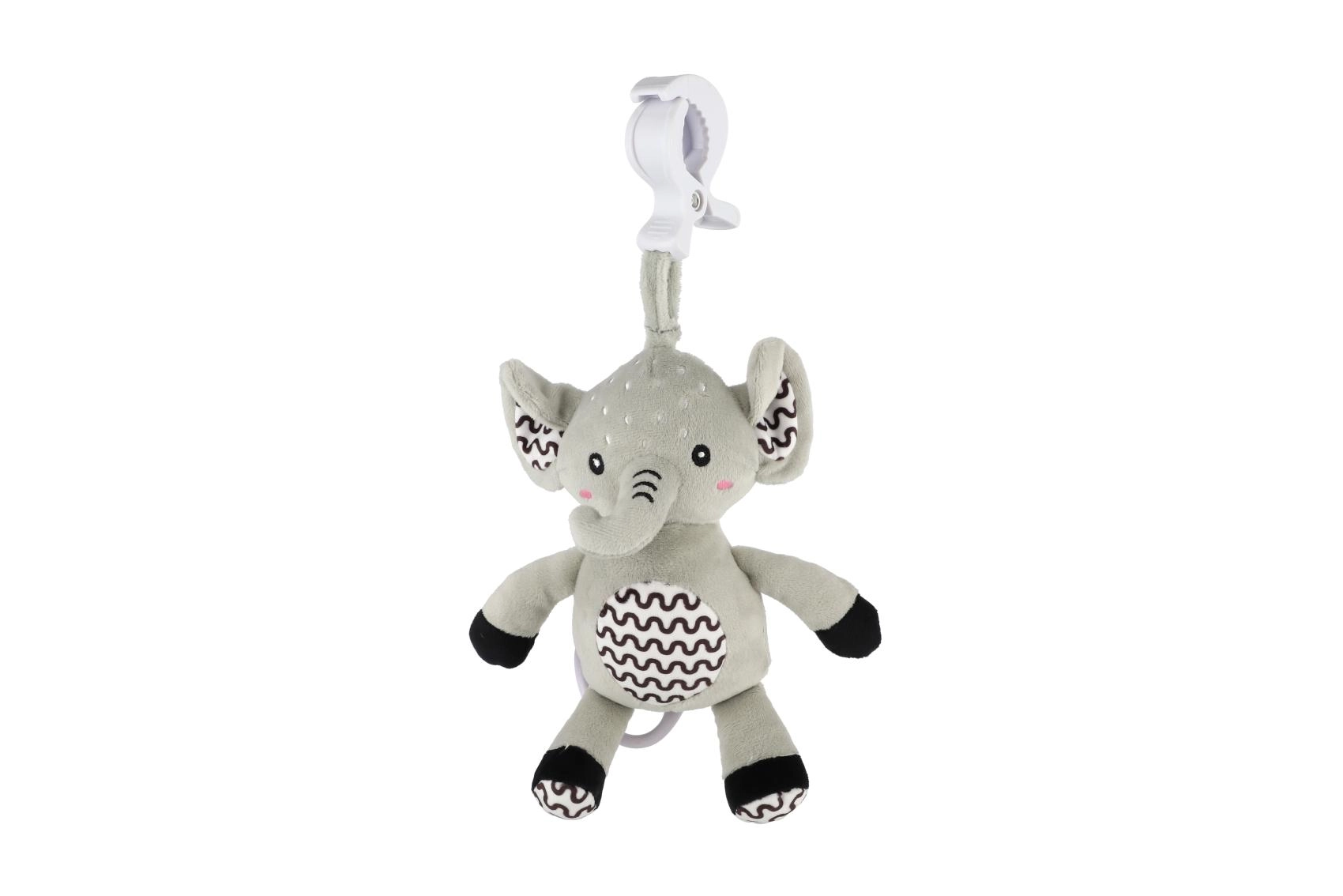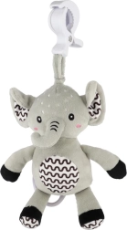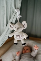 Tento měkoučký slon je ideální první hračka pro miminko. Po zatažení za kroužek se spustí jemná, uklidňující melodie, která pomáhá ke zklidnění a snadnějšímu usínání. Díky odolnému závěsnému klipu ho připevníte na postýlku, kočárek, autosedačku nebo hrací hrazdičku – váš drobeček tak má svého kamaráda stále u sebe.
