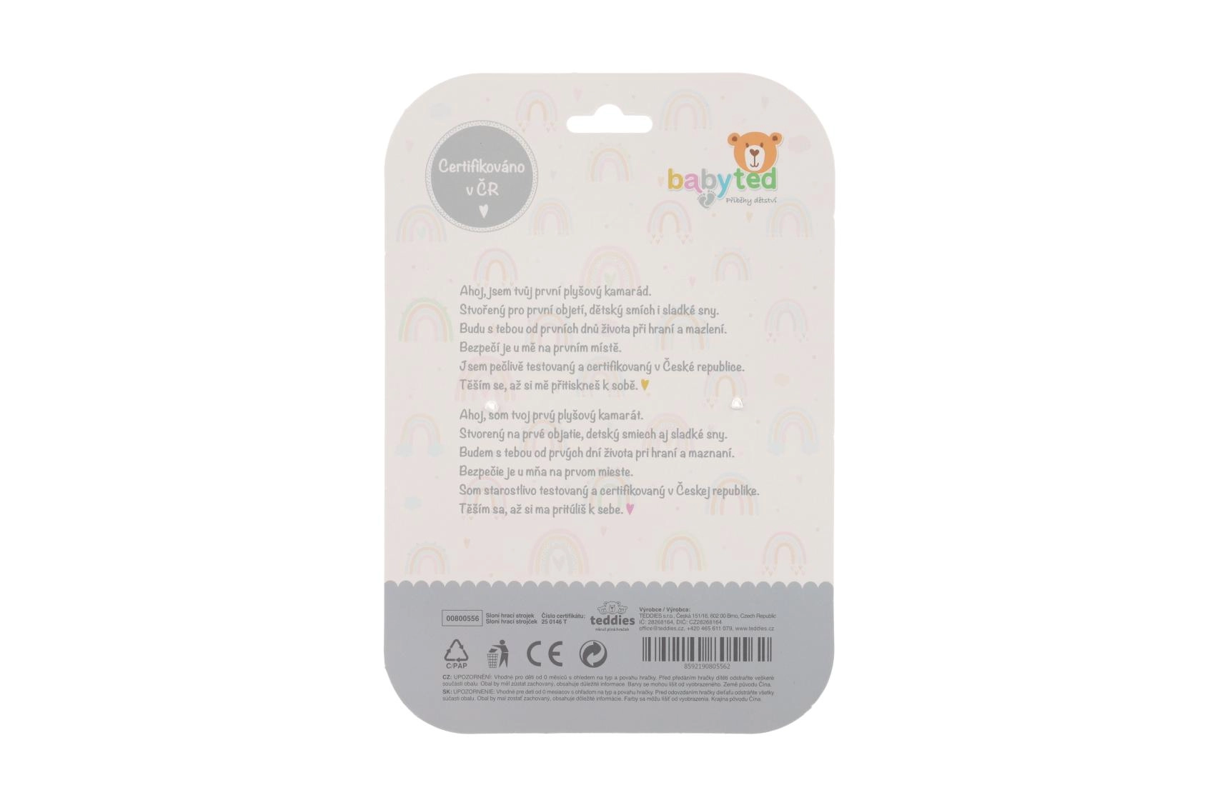 Hebký materiál je příjemný pro jemné dětské ruce a černobílé vzory na ouškách a bříšku podporují raný rozvoj zraku.