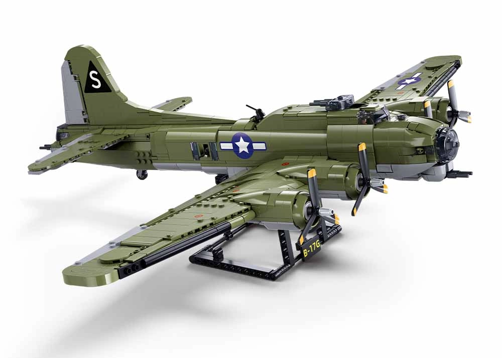 Model nabízí řadu funkčních prvků: zatahovací podvozek, otočné vrtule a pohyblivé části křídel a směrovky pro nastavení letové či přistávací konfigurace. Součástí je stojan s označením B-17G a 3 minifigurky členů posádky s doplňky. Stavebnice je kompatibilní s LEGO, Cobi i Mega Bloks, takže snadno rozšíříte svůj model o další prvky.