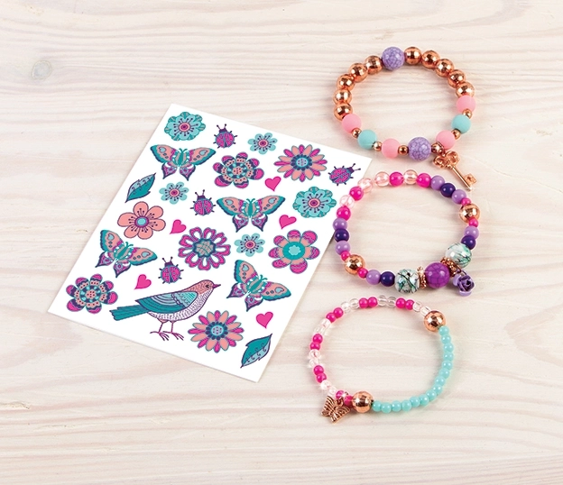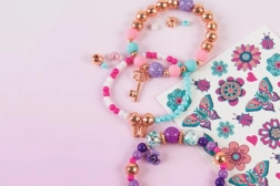 Rozviň kreativitu a navrhni si vlastní květinové náramky, které sladíš s dočasnými tetováními. Díky pestrým korálkům, přívěskům a jednoduchému navlékání vzniknou během chvilky šperky, které potěší každou malou parádnici.