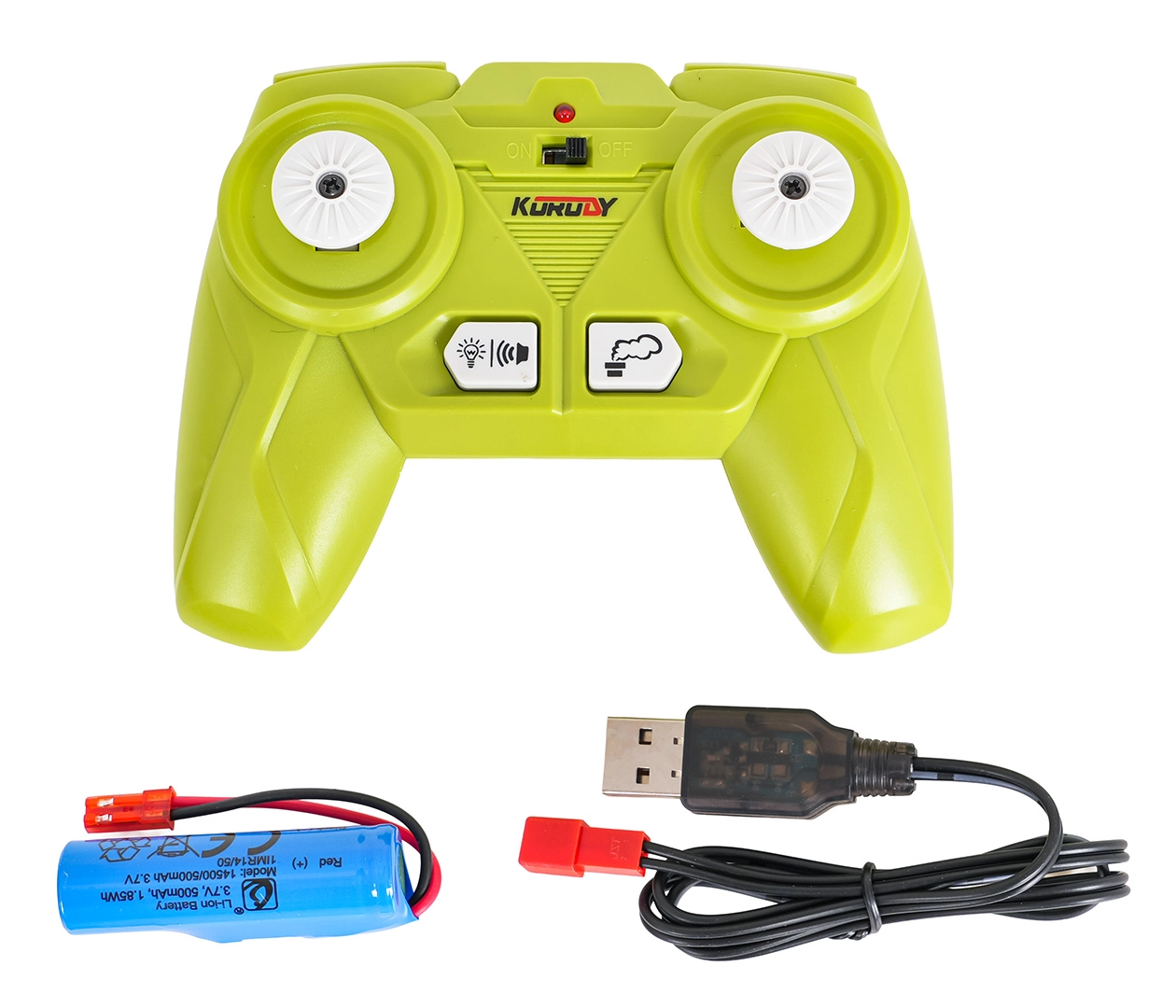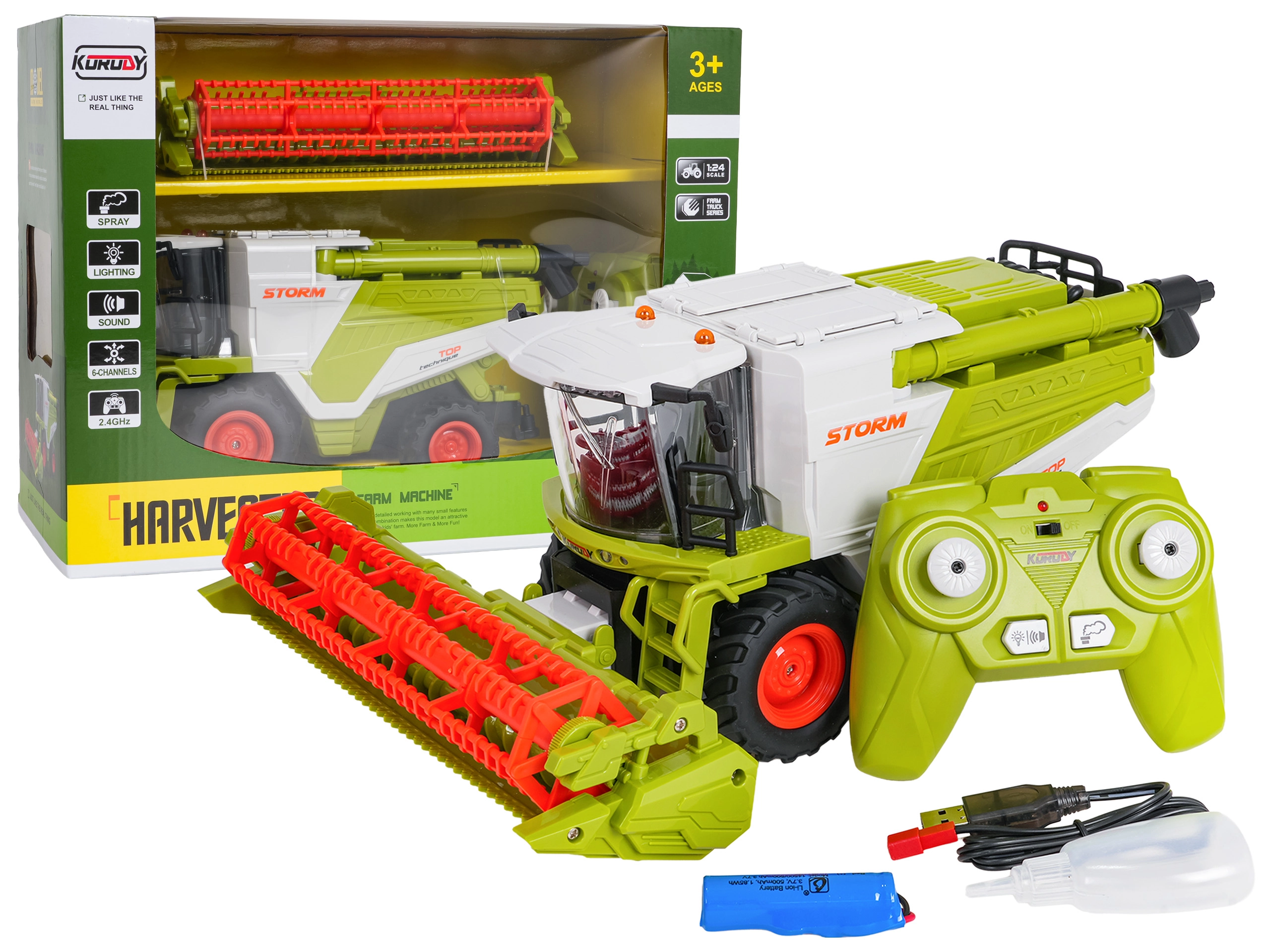 - Kombajn s hederem, dálkový ovladač 2,4 GHz, akumulátor 3,7 V, USB nabíjecí kabel, pipeta na vodu