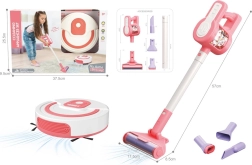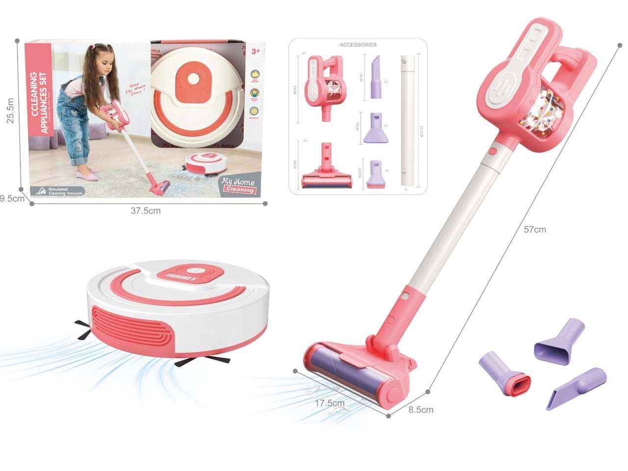 Zábavný a realistický dětský úklidový set s tyčovým vysavačem a robotickým vysavačem potěší malé pomocníky od 3 let. Nabízí vířící barevné kuličky v průhledné komoře, výměnné nástavce a robot s efektem sání a otáčejícími se kartáči. Vyrobeno z bezpečných materiálů, podporuje kreativitu, jemnou motoriku a návyk na pořádek.