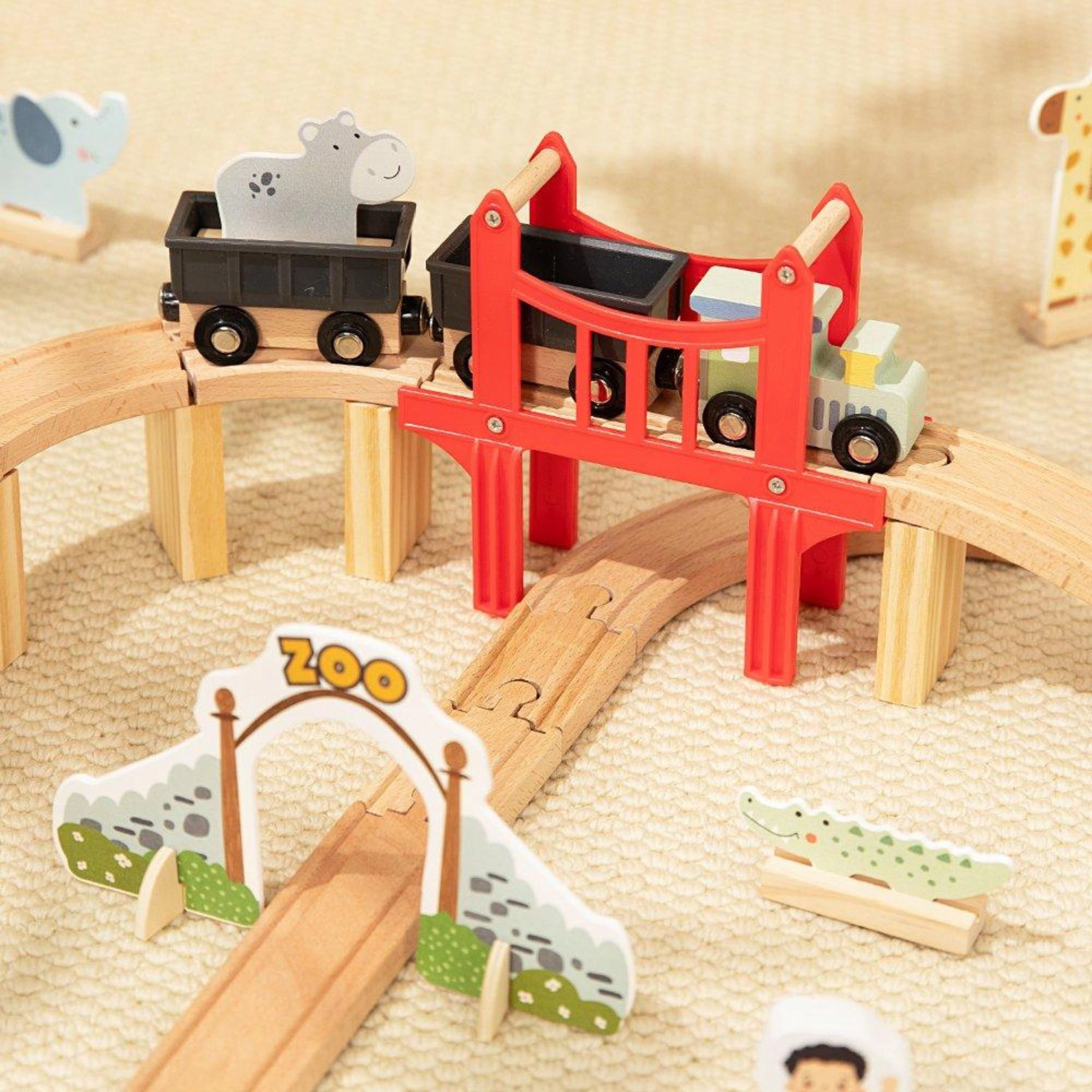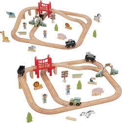 Set je navržen pro zábavu i rozvoj dovedností: skládání kolejí, manipulace s figurkami a plánování trasy podporují kreativitu, koordinaci oko–ruka a trpělivost. Kvalitní dřevěné zpracování zajišťuje odolnost a dlouhou životnost, zároveň je set kompatibilní s většinou oblíbených dřevěných vláčkodráh.