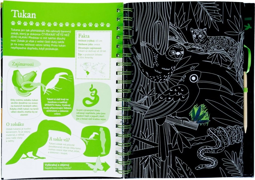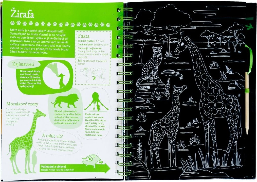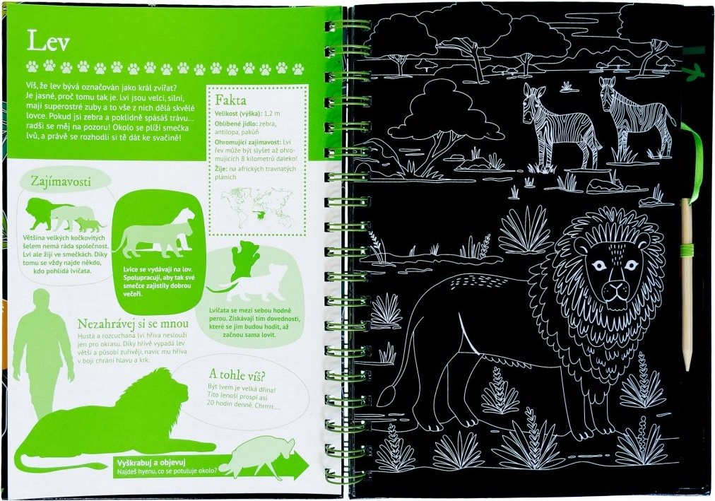 Tato nápaditá kniha je rozdělena do dvou částí – první přináší přehled zvířat s množstvím zajímavostí a fakt doplněných o vyškrabávací obrázky, které děti nadchnou svou hravostí. Druhá část nabízí interaktivní úkoly, jako jsou kvízy, přiřazování, hledání, kreslení a doplňování, díky nimž si děti nově nabyté znalosti procvičí a zabaví se na dlouhé hodiny.