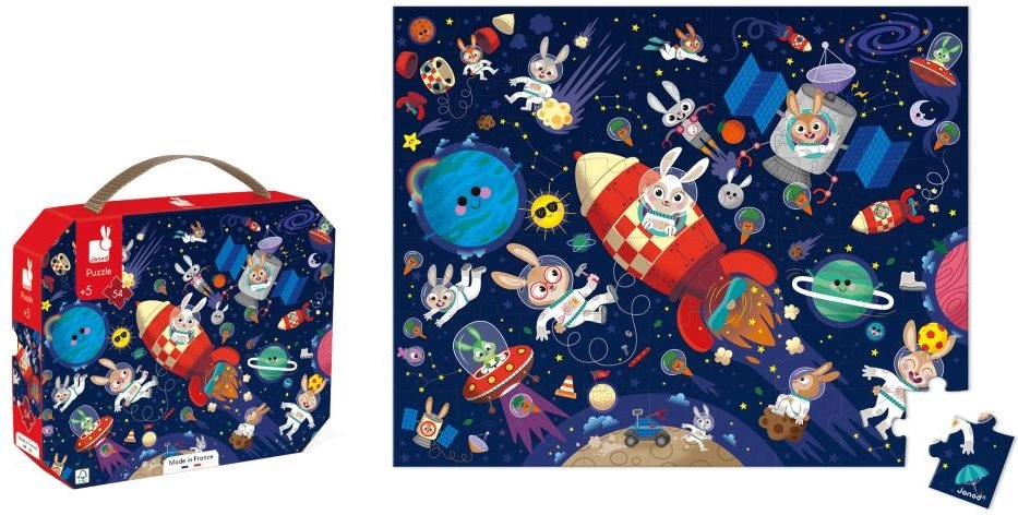 Stylové puzzle s vesmírným motivem rozvíjí dětskou představivost, trpělivost a jemnou motoriku. Praktický kartonový kufřík s uchem zajistí, že si děti mohou puzzle vzít kamkoli – na návštěvu, dovolenou i do školky. Součástí balení je také plakátová předloha, která pomáhá při skládání a podporuje samostatnost.