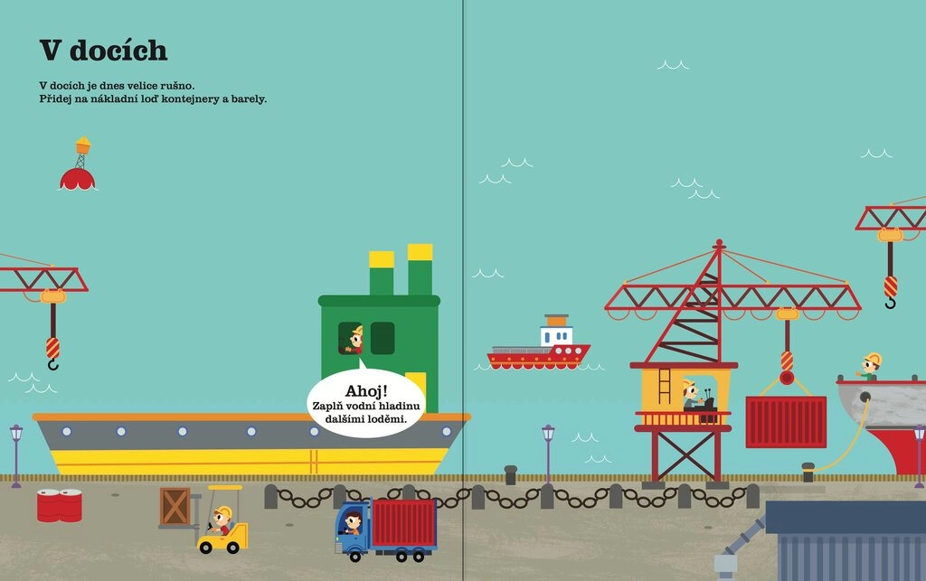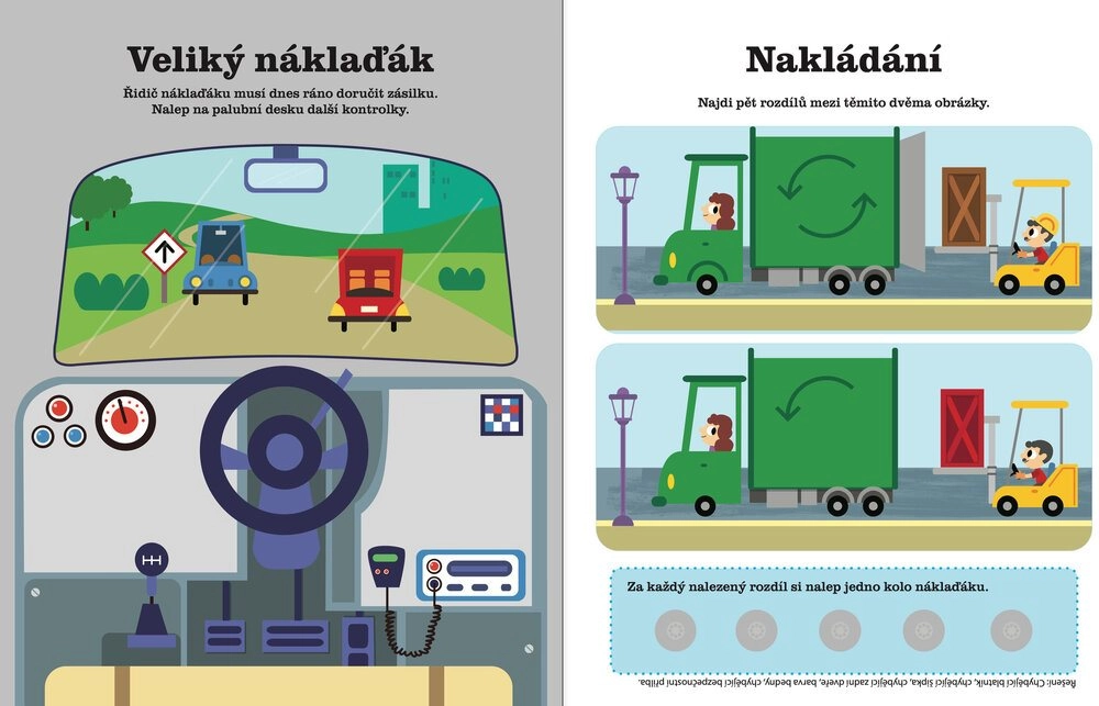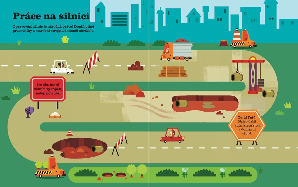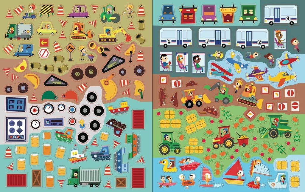 Více než 2000 samolepek lze lepit na příslušné scény, doplňovat obrázky nebo tvořit vlastní příběhy. Kniha podporuje rozvoj jemné motoriky, kreativitu i koordinaci oko–ruka a potěší všechny malé milovníky strojů a dopravních prostředků.