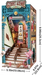 Tento DIY set z řady ROLIFE Book Nook promění vaši knihovnu v malebnou městskou uličku. Horní část scény nabízí pohled z úrovně ulice – nechybí lampy, cedule, dlažba ani zářící okna. Dole u schodů objevíte malé rekvizity městského života, jako papírový kelímek od kávy či růžovou kabelku, a pro milovníky cestování i motiv slunce a mapového pinu. Po zasunutí do police překvapí chytrý prvek: pod schody se skrývá mini nádraží, které se odhalí při vysunutí.