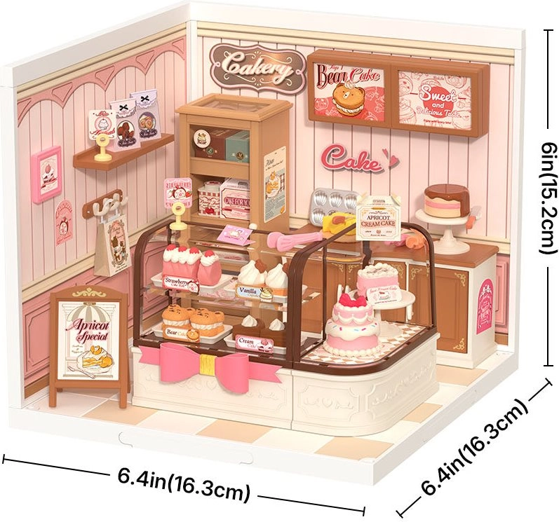 Objevte kouzlo miniaturní cukrárny, kde nechybí dortíky, rolády ani vrstvené dezerty, které vypadají jako k nakousnutí. Uprostřed zaujmou skleněné vitríny a dvojice pultů – jeden rovný a druhý elegantně zakřivený – s vystavenými cupcakes a makronkami s barevnými štítky. Nechybí kleště pro výdej a další dobroty schované vzadu, které dotvářejí autentickou atmosféru.