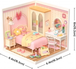 Tato nádherná mini ložnice v pastelových tónech přináší vše, co milovníci miniatur ocení: postel s textiliemi, toaletní stolek se zrcadlem, noční stolek, vestavěnou skříň a množství drobných doplňků. Teplé LED osvětlení vytváří příjemnou atmosféru a podtrhuje detailní zpracování nábytku i dekorací.