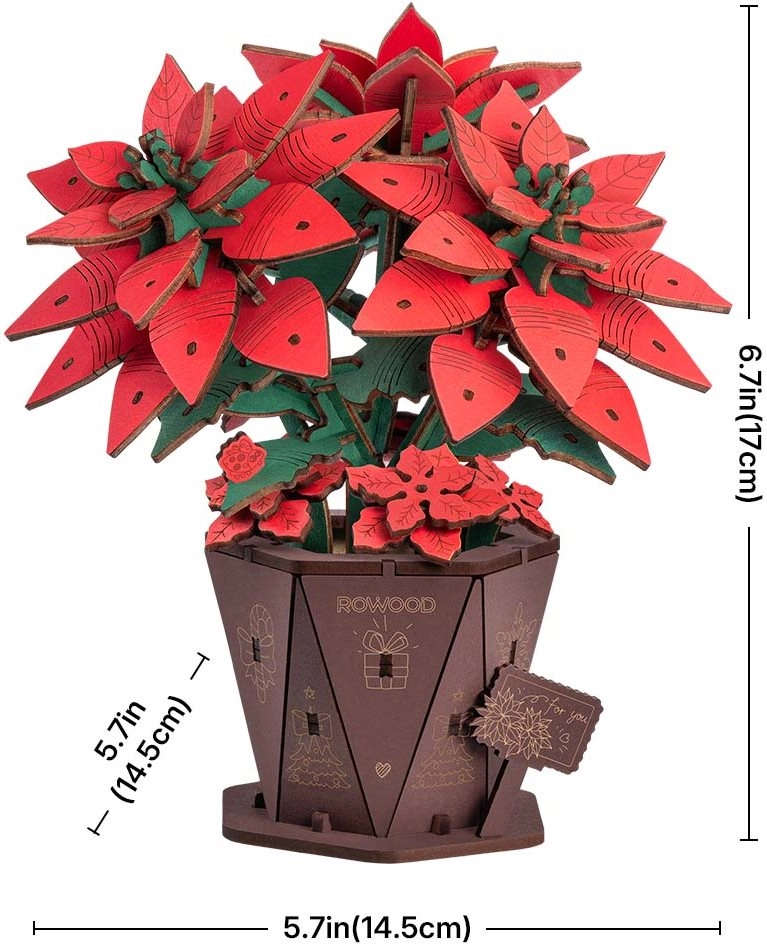 Tato elegantní 3D dřevěná vánoční hvězda v květináči se skládá z laserem vyřezaných dílů, které jsou očíslované pro rychlou a intuitivní montáž. Díky pevné konstrukci drží tvar a po sestavení vytvoří působivou sváteční ozdobu s realistickými listy a okvětními lístky.