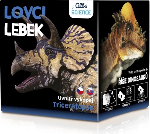 Objevte kouzlo paleontologie přímo u vás doma. Sada Lovci lebek – Triceratops ukrývá repliku dinosauří lebky v hliněném kvádru, kterou postupně vykopete pomocí přiložených nástrojů. Poté nález očistíte a hrdě vystavíte na podstavci jako originální dekoraci do dětského pokoje či herny.