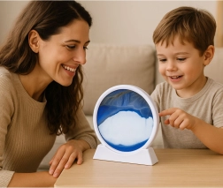 Pozorujte, jak modrý a bílý písek tvoří stále nové krajiny. Ideální pro relaxaci, meditaci i krátké pauzy během práce.