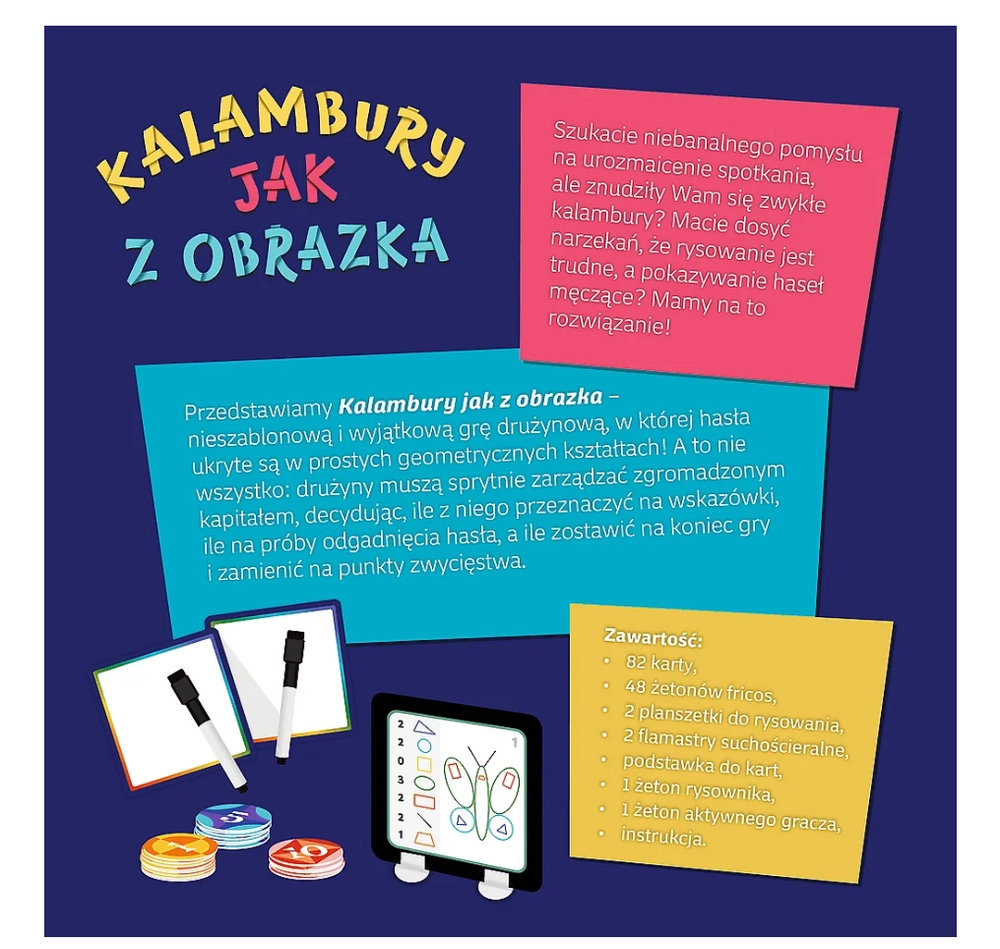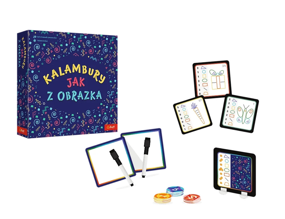 Objevte originální týmovou hru, kde jsou hesla ukryta v jednoduchých tvarech. Pomocí geometrických dílků vytváříte obrázky a vedete tým k řešení. Kreativita, strategie a zábava pro celou rodinu – to je Kalambury: jako z obrázku od Trefl.