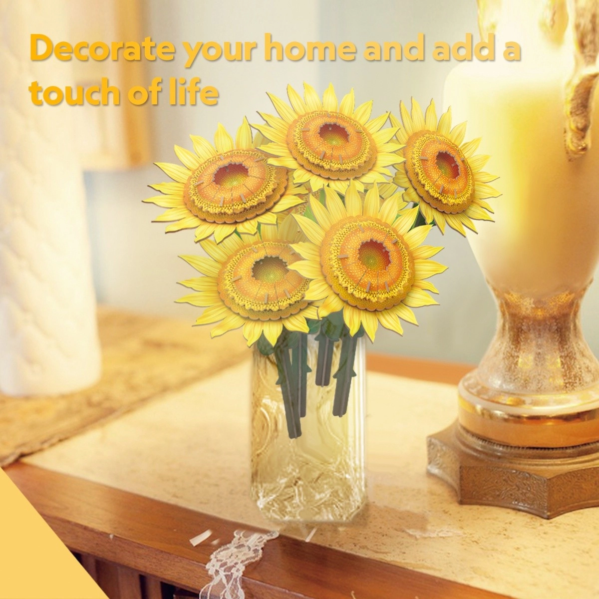 Tato sada CubicFun potěší milovníky květin i 3D puzzlí. Hotová dekorace přinese do vašeho domova teplé barvy slunečnic a zůstane krásná po celý rok.