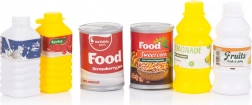 Papírové krabičky potravin a dětské lahve a plechovky dodají hře autenticitu – ideální pro sestavování nákupních seznamů a třídění potravin.